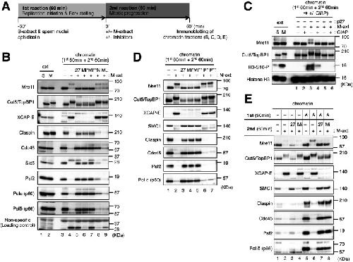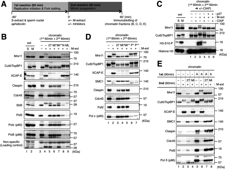Figure 1. Mre11 exonuclease activity is required for mitotic entry and mitotic replisome disassembly in the presence of stalled replication forks.(A) The basic experimental design. In the first reaction, sperm nuclei (5,000/μl) were incubated for 60 min in 20 μl of S-phase/interphase egg extract (S-extract) with 10 μg/ml of aphidicolin. In the second reaction, 20 μl of M-phase egg extract (M-extract) was added to the first reaction mixture together with an additional 10 μg/ml of aphidicolin to induce mitotic entry and replisome disassembly. After 60-min incubation of the second reaction, chromatin fractions were isolated and analyzed by immunoblotting. (B, D) The effects of inhibitors on mitotic entry and replisome disassembly. The second reaction was performed in the absence or presence of 100 μg/ml of His-p27 (27), 50 μM mirin (Mi*), 100 μM mirin (Mi**), 100 μM NMS-873 (N), 10 μM MLN-4924 (ML), 50 μM PFM01 (P*), or 100 μM PFM01 (P**). (C) Role of phosphorylation in mitotic mobility shifts of Mre11 and Cut5/TopBP1. The isolated chromatin fractions were treated with or without calf intestine alkaline phosphatase (+/−CIAP) and analyzed by immunoblotting. In (B) and (C), 0.5 μl of S-phase and M-phase extracts (ext S, M) was analyzed by immunoblotting as controls. (E) Comparison of mitotic entry between replication-complete and replication-incomplete nuclei. The first reaction was performed for 90 min with (replication-incomplete) and without (replication-complete) aphidicolin.Source data are available for this figure.