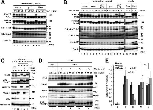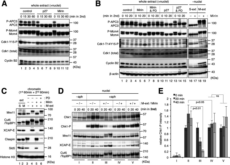 Figure 3. Mitotic CDK activity is inactivated by Wee1/My1 in the absence of Mre11-dependent processing of stalled forks.(A) Inactivation of mitotic CDK activity in the presence of mirin. The same experiment with that shown in Fig 1B was performed with the indicated conditions. After 0-, 15-, 30-, and 60-min incubation of the second reaction, 1 μl of the whole extract was sampled and analyzed by immunoblotting. (B) The dependence of CDK inactivation on Wee1/Myt1 kinases. The same experiment with that shown in Fig 1B was performed with the indicated conditions. After 0-, 10-, and 20-min incubation of the second reaction, 1 μl of the whole extract was sampled and analyzed by immunoblotting (lanes 1–15). As controls, S-phase and M-phase extracts (S-ext and M-ext) were incubated without nuclei for 40 min in the absence and presence of mirin, and 1 μl of each were sampled and analyzed by immunoblotting. (C) The recovery of mitotic entry by the inhibition of Wee1/Myt1. The same experiment with that shown in Fig 1B was performed with the indicated conditions, and the chromatin fractions were isolated and analyzed by immunoblotting. (A, B, C, D) His-p27 (p27), mirin, and PD166285 (PD) were used at final concentrations of 100 μg/ml, 100 μM, and 10 μM, respectively. (D, E) The effect of mirin for the ATR-Chk1 checkpoint activity. The same experiment with that shown in Fig 1B was performed with the indicated conditions, and the nuclear fractions were isolated and analyzed by immunoblotting. The relative mean values of Chk1-P intensities of three independent experiments were shown in the graph using Cut5/TopBP1 intensities as loading controls. Error bar, ± S.D. P-values were calculated by the unpaired t test (one-tailed). ns, not significant.Source data are available for this figure.