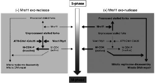 Mre11 exonuclease activity promotes irreversible mitotic progression under replication stress.