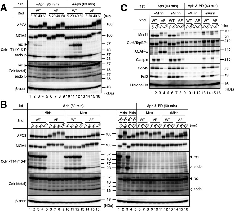 Figure 4. A nonphosphorylatable CDK1 mutant can promote mitotic entry without Mre11 exonuclease activity.(A) The ability of the recombinant CDK complexes of MBP–cyclin B1-ΔN90 with GST-CDK1 wild type (CDK-WT, WT) or GST-CDK1-T14A/Y15F (CDK-AF, AF) to promote mitotic entry in the absence or presence of replication stress. In the first reaction, sperm nuclei (5,000/μl) were incubated for 80 min in 20 μl of S-phase egg extract with (+Aph) or without (−Aph) 10 μg/ml of aphidicolin. In the second reaction, CDK-WT or CDK-AF was added at 2.2 μM and incubated for the indicated times (5, 20, 40, and 60 min). 1 μl of the whole extracts were sampled and analyzed by immunoblotting. The positions of recombinant GST-CDK1 (rec) and endogenous CDK1 (endo) are indicated by filled and open triangles, respectively. (B, C) Restoration of mitotic entry by the nonphosphorylatable CDK1 mutant. (A) A similar experiment with that shown in (A) was performed with the indicated conditions. PD166285 (PD) and mirin were added at 5 and 100 μM, respectively. (B, C) The whole extract (B) and the chromatin fractions (C) were analyzed by immunoblotting.Source data are available for this figure.
