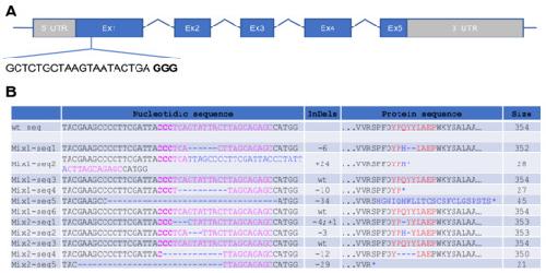 Figure 1. Genomic analysis of X. tropicalis rho crispants. (A) Schematic of the Xenopus tropicalis rho gene. The depicted sequence corresponds to the CRISPR RNA targeting exon 1 and to the protospacer adjacent motif (PAM; indicated in bold). (B) Sequences obtained from individual clones of PCR products amplified from genomic DNA. Two mixtures (Mix1, 2) of 5 X. tropicalis F0 embryos injected with 500 pg of rho sgRNA and 600 pg of cas9 mRNA were used. For each clone, the targeted sequence is shown in pink, with PAM in bold, while indels are in blue. The right column indicates the corresponding protein sequence and its size (number of amino acids). |