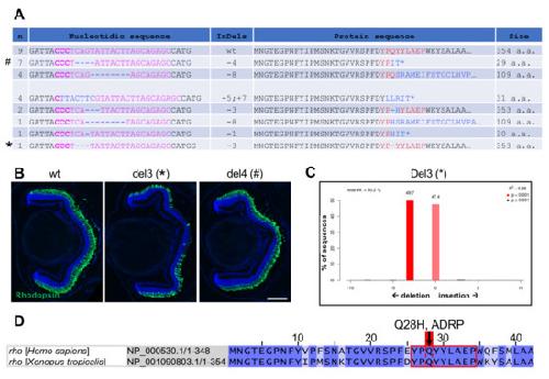Figure 4. Characterization of F1 X. tropicalis rho mutants. (A) Genomic sequences retrieved from F1 X. tropicalis rho mutants. The left column indicates the number of tadpoles harbouring the corresponding sequence. The targeted region is shown in pink with PAM in bold, while indels are in blue. The right column indicates the resulting protein sequence and its size (number of amino acids). (B) Immunofluorescence analysis of Rhodopsin expression on retinal sections from stage 45 wild-type and F1 individuals. Del3 and del4 tadpoles bear the sequences depicted in A with * (leading to lack of glutamine 28) and # (leading to a truncated protein), respectively. Cell nuclei are counterstained with Hoechst (blue). (C) TIDE analysis of the del3 rho mutant showing the presence of a wild-type and a mutated allele. (D) Illustration of Homo sapiens and X. tropicalis Rhodopsin protein sequences (amino acids 1 to 42). The region targeted by the rho sgRNA (red square) is conserved between the two species and includes glutamine 28, whose mutation Q28H was found in patients with autosomal dominant retinitis pigmentosa (ADRP). Scale bar: 100 µm. |
