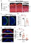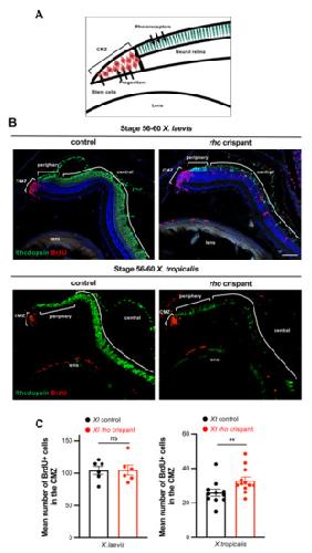 Figure 7. Analysis of proliferative CMZ cells in X. tropicalis and X. laevis rho crispants. (A) Schematic representation of the peripheral part of the retina. Stem cells and progenitors lie at the tip within the ciliary marginal zone (CMZ), while newly produced differentiated cells are found more centrally (only photoreceptors are shown here). (B) Typical retinal sections from stage 60 control and crispant X. laevis and X. tropicalis tadpoles, immunostained for Rhodopsin and BrdU (protocol illustrated in the timeline diagram of Figure 6A). Cell nuclei are counterstained with Hoechst (blue). (C) Quantification of BrdU-labelled cells in the CMZ. In graphs, data are represented as mean ± SEM, and each point represents one retina. ** p < 0.01; ns: non-significant (Mann–Whitney tests). Scale bar: 50 µm. |