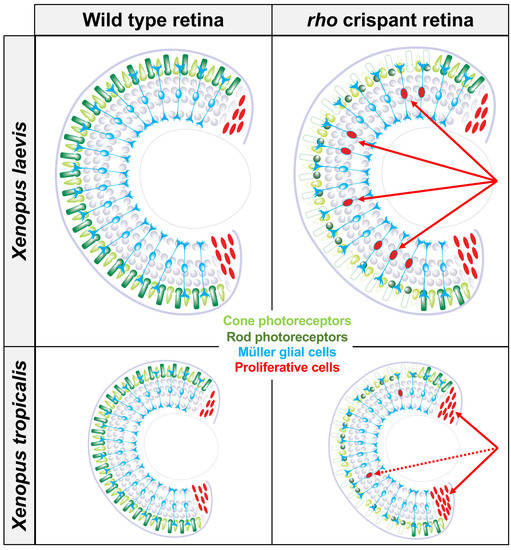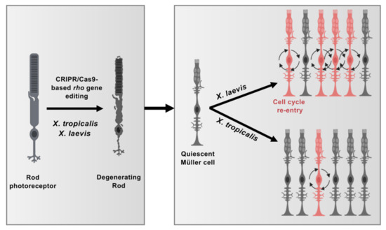 Figure 8. Model illustrating differences in Müller cell response to injury in X. tropicalis and X. laevis. CRISPR/Cas9-mediated rho editing triggers rod photoreceptor degeneration in both X. tropicalis and X. laevis. Quiescent Müller cells respond to this pathological context by re-entering into cell cycle. While Müller cell proliferation is greatly enhanced in X. laevis, it remains limited in X. tropicalis, suggesting divergent regenerative properties of these closely related species. This figure was created with schemas from ©BioRender—biorender.com accessed on November 2021. |