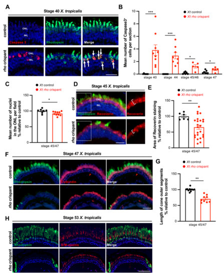 Figure 3. Rod cell death and cone defects in X. tropicalis rho crispants. (A) Typical retinal sections from stage 40 control and crispant X. tropicalis embryos, immunostained for cleaved Caspase 3 and Rhodopsin. Arrows point to double positive cells. (B) Quantification of Caspase 3-positive cells from stage 40 to stage 47. (C) Quantification of ONL nuclei on retinal sections from stage 45/47 control and crispant X. tropicalis tadpoles. Nuclei were counted in one standard square field per section. (D,E) Immunofluorescence analysis of Recoverin expression on retinal sections from stage 45 control and crispant X. tropicalis tadpoles. Sections were co-stained for Rhodopsin for comparison. Panels on the right show the regions delineated with the dotted white boxes and highlight the decreased thickness of Recoverin staining in crispants (brackets). The total area of Recoverin staining is quantified in (E). (F) Typical retinal sections from stage 47 control and crispant X. tropicalis tadpoles, immunostained for Rhodopsin and Calbindin (a marker of cone photoreceptors). (G) Quantification of cone outer segment length. (H) Retinal sections from stage 53 control and crispant X. tropicalis tadpoles, immunostained for Rhodopsin and S/M-opsin (a marker of cone photoreceptors). Note the continuous but thinner staining in the outer nuclear layer of crispant tadpoles. In (A,D,F,H), cell nuclei are counterstained with Hoechst (blue). In graphs, data are represented as mean ± SEM, and each point represents one retina. * p < 0.05; ** p < 0.01; *** p < 0.001 (Mann–Whitney tests). Scale bar: 25 µm in (A,D) and 50 µm in (F,H). |