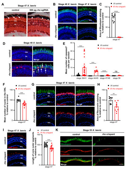 Figure 5. Rod degeneration and cone defects in X. laevis rho crispants. (A) Hematoxylin and Eosin staining on retinal sections from stage 47 control and rho crispant X. laevis tadpoles. The dotted line delineates the border between the outer nuclear layer and photoreceptor outer segments (arrows). Arrowheads point to shortened outer segments. (B,C) Immunofluorescence analysis of Rhodopsin expression on retinal sections from control and crispant X. laevis tadpoles at stage 40 or 47. The area of Rhodopsin staining at stage 47 is quantified in (C). (D) Typical retinal sections from stage 40 control and crispant X. laevis embryos, immunostained for cleaved Caspase 3 and Rhodopsin. Arrows point to double positive cells. (E) Quantification of Caspase 3-positive cells from stage 39/41 to stage 59. (F) Quantification of ONL nuclei on retinal sections from stage 47 control and crispant X. laevis tadpoles. Nuclei were counted in one standard rectangle field per section. (G,H) Immunofluorescence analysis of Recoverin expression on retinal sections from stage 47 control and crispant X. laevis tadpoles. Sections were co-stained for Rhodopsin for comparison. The area of Recoverin staining is quantified in (H). (I,J) Immunofluorescence analysis of S/M-opsin expression on stage 47 control and crispant X. laevis tadpoles. The length of S/M opsin-labelled outer segments is quantified in (J). (K) Typical retinal sections from stage 53 control and crispant X. laevis tadpoles, immunostained for calbindin. Note the continuous but thinner staining in the outer nuclear layer of crispant tadpoles. In (B,D,G,I), cell nuclei are counterstained with Hoechst (blue). In graphs, data are represented as mean ± SEM and each point represents one retina. ** p < 0.01; *** p < 0.001; **** p < 0.0001; ns: non-significant (Mann–Whitney tests). GCL: ganglion cell layer, INL: inner nuclear layer, ONL: outer nuclear layer, OS: outer segment. Scale bar: 25 µm in (A,B,D,H,I) and 50 µm in (K). |