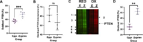 Fig. 6. Fertilisation increases PTEN-specific reversible thiol oxidation. A. Protein A mode RedoxiFluor revealed a significant (unpaired t-test, P = 0.0002, n = 6) fertilisation-induced increase in PTEN-specific reversible thiol oxidation in 1-cell zygotes compared to unfertilised eggs in X. laevis. B. Macroscale RedoxiFluor found no significant (unpaired t-test, P = 0.2592, n = 3) difference in PTEN interactome redox state in 1-cell zygotes compared to unfertilised eggs in X. laevis. C. A representative SDS-PAGE gel image showing the PTEN (highlighted) and the redox state (reduced = green channel; oxidised = red channel) of its interactome (arrows 1–6 correspond to coeluting proteins with molecular weights of ∼100, 75, 60, 37, 25 and 10 kDa, respectively) in unfertilised eggs (E) and zygotes (Z). D. Quantifying the redox state of the PTEN-specific band manually excised and eluted from (C) in unfertilised eggs and 1-cell zygotes in X. laevis confirmed the significant (unpaired t-test, P = 0.0020, n = 3) fertilisation-induced increase in PTEN-specific reversible thiol oxidation. Data are presented as the mean (M) and standard deviation (SD). (For interpretation of the references to colour in this figure legend, the reader is referred to the Web version of this article.) |