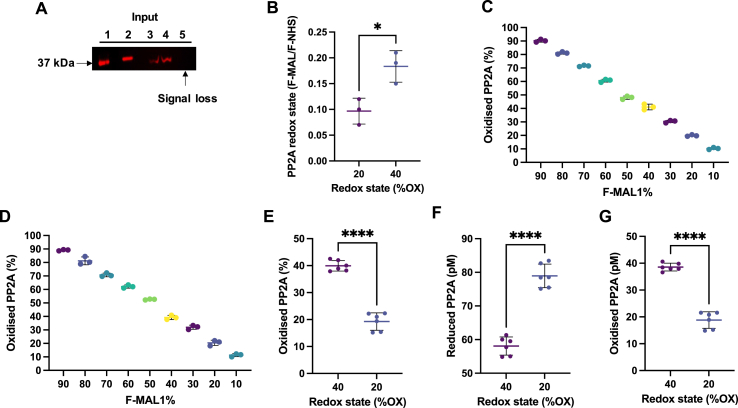 Fig. 2. RedoxiFluor can quantify target-specific protein thiol redox state in relative percentage and molar terms. A. Click-PEG cannot detect PP2A redox state, as evidenced by the loss of signal in the “PEGylated” lanes (3–5) compared to lysates (lane 1) and the PEG-free clickable maleimide handle only control (lane 2). B. ALISA detected a significant difference (unpaired t-test, P = 0.0192, n = 3) between the 20 and 40% redox states. C. Protein A mode RedoxiFluor can accurately and reproducibly discern between different PP2A redox states ranging from 10 to 90% reversibly oxidised (n = 3 per standard, see methods). D. ELISA mode RedoxiFluor can accurately and reproducibly discern between different PP2A redox states ranging from 10 to 90% reversibly oxidised (n = 3 per standard, see methods). A separate PP2A ELISA mode standard experiment quantifying significant differences (unpaired t-tests, P = < 0.0001 in panels E–G, n = 6) between the 20 (n = 6) and 40% (n = 6) reversibly oxidised states in percentages (E) and picomoles of reduced (F) and reversibly oxidised (G) protein. All standards and samples were derived from Xenopus laevis lysates (see methods). Data are presented as the mean (M) and standard deviation (SD). |
