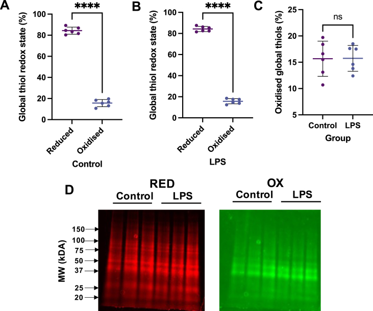 Fig. 3. No difference in the redox state of the bulk thiol proteome in unstimulated (control) and LPS-stimulated human monocytes. Significant differences (paired t-tests, P = < 0.0001 in panels A–B, n = 6) in percent reduced compared to percent oxidised protein in unstimulated (control, panel A) and LPS-stimulated (panel B) human monocytes. C. No significant difference (unpaired t-test, P = 0.9694, n = 6) in percent reversibly oxidised protein in LPS-stimulated human monocytes compared to unstimulated human monocytes. D. A representative SDS-PAGE gel image showing that both proteomes are highly reduced and similar band patterns in the reduced (red channel, F-MAL1) and reversibly oxidised (green channel, F-MAL2) channels in control and LPS samples. Data are presented as the mean (M) and standard deviation (SD). (For interpretation of the references to colour in this figure legend, the reader is referred to the Web version of this article.) |