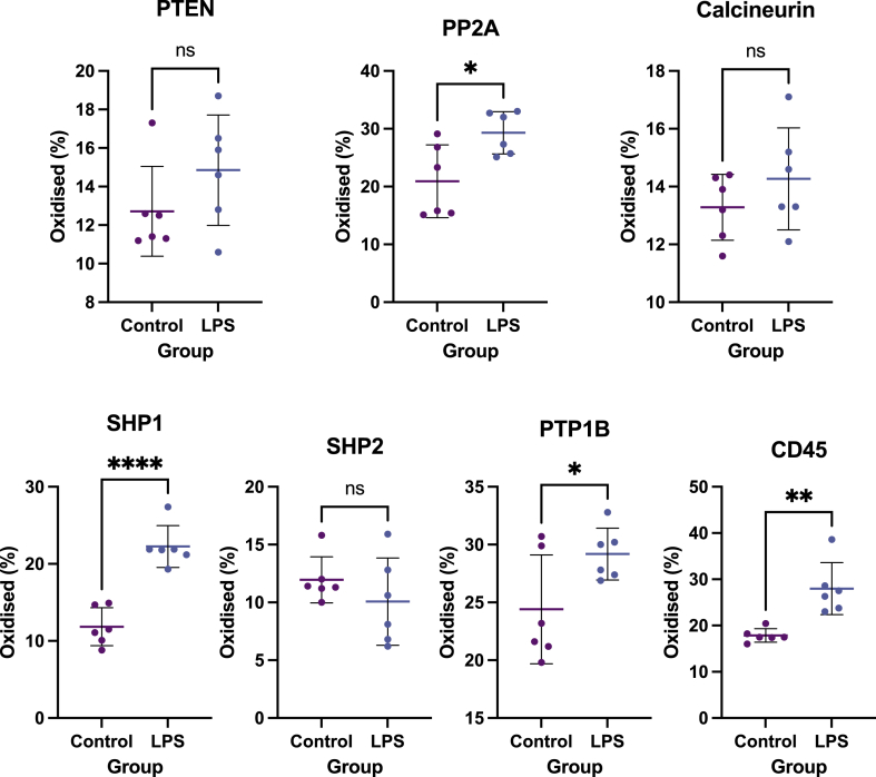 Fig. 5. LPS increases PP2A-, PTP1B-, SHP1-, and CD45-specific reversible thiol oxidation. No significant difference (all unpaired t-tests and n = 6) in PTEN (P = 0.1871), SHP2 (P = 0.3054), and calcineurin (P = 0.2780) specific reversible thiol oxidation (i.e., percent oxidised protein) in unstimulated (control) and LPS-stimulated human monocytes as determined by array mode RedoxiFluor. A significant (all unpaired-tests and n = 6) LPS-induced increases in PP2A (P = 0.0181), SHP1 (P < 0.0001), PTP1B (P = 0.0483), and CD45 (P = 0.0018) specific reversible thiol oxidation occurred in LPS-stimulated human monocytes compared to unstimulated controls. Data are presented as the mean (M) and standard deviation (SD). |