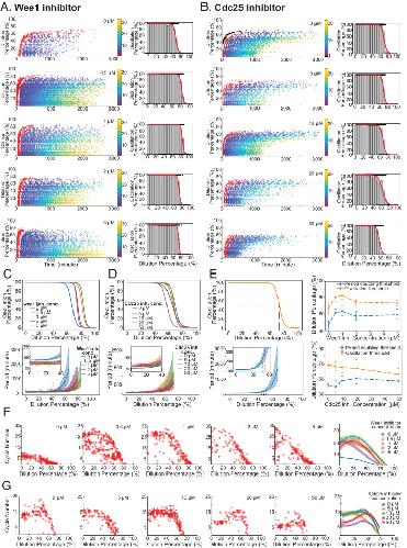 Fig. 4. Cdk1 positive feedbacks are not essential for robustness to cytoplasmic dilution. (A and B) Extracts were supplemented with 0, 0.5, 1, 2, and 5 μM Wee1 activity’s inhibitor PD166285 (A) or with 0, 5, 10, 20, and 50 μM NSC95397 for inhibiting Cdc25 phosphatase activity (B) and then tested for their robustness to dilution. For each inhibitor concentration, the raster plot of the experimental result is shown as well as the oscillation percentage obtained. The system retains its function for most of the dilution range (0 to 60%) for all inhibitor concentrations with a slight difference in the absolute threshold values and the onset time and end time of oscillations. (C and D, Top) All oscillation percentage curves together to highlight the differences observed near the thresholds at different inhibitor concentrations of PD166285 (C) and NSC95397 (D). (Bottom) The obtained period profiles as a function of dilutions. (Insets) Zoomed-in views for the changes in period for low dilutions in which the curve is mostly flat. Period curves were fitted to exponential functions, and bootstrap was performed on the data to obtain CIs for the parameters. Shaded region represents one SD from the average parameters. (E) Quantification of robustness to dilution. (Left) Two different ways of measuring robustness based on oscillation percentage (Top) and period curves (Bottom). For oscillation percentage, we extract the dilution required for 90, 50, and 10% oscillation percentage and define the oscillation threshold as the dilution percentage at 50% oscillation percentage. For period curves, we calculate the dilution percentage at which period doubles to be defined as the period-doubling threshold. The estimated error on the parameters is used to infer a CI for the period-doubling dilution. (Right) The oscillation and period-doubling threshold change as a function of inhibitor concentration. Top corresponds to Wee1 inhibitor experiments and Bottom to Cdc25. (F and G) Total number of cycles as a function of dilution percentage for different concentrations of Wee1 inhibitor (F) and Cdc25 inhibitor (G). Rightmost plots show all the curves together smoothed by locally weighted scatterplot smoothing for ease of comparison. It can be appreciated that the inhibition of Wee1 increases the cycle number for low dilutions. The addition of the Cdc25 inhibitor tends to decrease the number of cycles in the system for most dilutions.