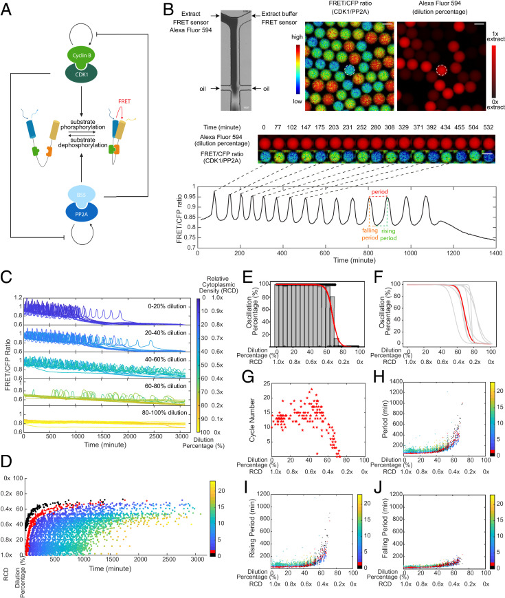 Fig. 1. In vitro cell-cycle oscillators are robust to cytoplasmic dilutions. (A) Schematic diagram of the phosphorylation and dephosphorylation cycles of mitotic substrates driven by kinase, Cdk1–cyclin B, and its counteracting phosphatase, PP2A-B55δ, which mutually modulate each other’s auto-activation loops. The full diagram for the cell-cycle oscillator is in Fig. 3A. A Cdk1 FRET sensor is used to measure the ratio of Cdk1–cyclin B to PP2A:B55δ activity throughout oscillations. (B) FRET-based quantification of cell-cycle dynamics in microemulsion droplets containing 0 to 100% diluted Xenopus extracts. (Top Left) A microfluidic device generates droplets containing extracts and extract buffer mixed at different ratios. The extracts supplied with Alexa Fluor 594 Dextran dye flow through one inlet and the extract buffer through the other, both containing the same concentration of the Cdk1-FRET sensor. The diluted extracts are then encapsulated by surfactant oil into uniform-sized microemulsion droplets. (Top Right) Snapshots of FRET/CFP ratio and Alexa Fluor 594 Dextran channels for a field of droplets indicating the ratio of Cdk1/PP2A activity and the dilution percentage. (Middle) Time-lapse series of a selected droplet showing the first 550-min imaging in both channels. Selected time points correspond to either a peak or trough in FRET/CFP signals. The droplet has a constant red fluorescence intensity over time, indicating no leakage of the dye. (Scale bar, 100 μm.) (Bottom) Time course of FRET/CFP ratio of the selected droplet showing 15 undamped oscillations in 1,400 min. The oscillation period is quantified as the time interval between two consecutive peaks. The rising period (interphase duration) is defined as the time interval between a trough to the subsequent peak and the falling period (duration of mitosis) as the time interval between a peak to the subsequent trough. (C) Time courses of FRET/CFP ratio for droplets with 0 to 100% diluted extracts show the cell-cycle robustness to cytoplasmic dilutions. Each line represents a droplet, and the color of the line indicates the dilution percentage (RCD) of the droplet. The cytoplasmic density of undiluted droplets (dilution 0%) is defined as 1.0×. A total of 20 droplets are randomly selected from each dilution range and presented in the plot. In both C and D, t = 0 represents the start of imaging which was typically 1 h after extract preparation. (D) Raster plot showing peak times of FRET/CFP ratio as a function of dilution. The entry of the first cycle is significantly delayed as dilution percentage increases, and the overall oscillation time (from the start of the first peak to the last peak) is extended as well. Each dot represents a cycle peak in a droplet. The color bar indicates the order of peaks in time. The first peak observed in undiluted extracts is labeled in red and noted as cycle 1. Because of delays caused by dilution, a previous peak can be observed for some droplets with high levels of dilution which we note as cycle 0 (labeled in black). Cycle 0 is not observed in undiluted extracts because of the 1-h gap between extract preparation and the start of imaging. (E) Oscillation percentage of droplets over different dilution ranges. Oscillation percentage is calculated as the percentage of droplets that exhibit oscillations in all tracked droplets within each bin range. The bin width in the histogram is five. The red curve is the logistic regression fitting result for oscillation percentage data. This dataset includes 655 detected droplets in which 351 droplets yield oscillations. (F) Logistic regression fits for oscillation percentage versus dilution for nine replicates, showing the cell cycle robustness to dilutions is highly conserved across all different day experiments. The red highlighted curve corresponds to the experiment in E. (G) The cycle number versus dilution of individual droplets presents an initial plateau within low-moderate dilution ranges and subsequently decreases as a function of dilution. Cycle number for each droplet was quantified by a total number of peak-to-peak FRET/CFP oscillations. (H) Oscillation periods remain relatively constant up to 50% dilution and afterward increase dramatically with dilution until the dilution is close to 80%. Similar trends are observed in (I) rising periods and (J) falling periods. Each dot indicates one cycle in a droplet. The color bar represents the order of cycles.