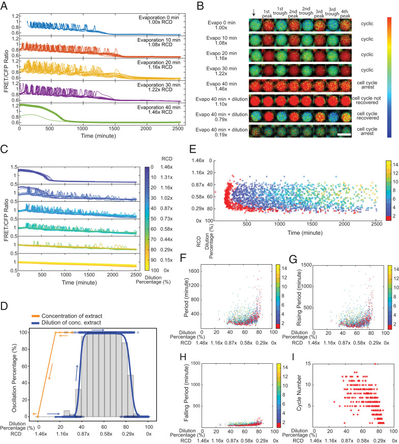 Fig. 2. Cytoplasmic concentration leads to a reversible loss of oscillation but displays hysteresis. (A) Time courses of FRET/CFP ratio for individual droplets with concentrated extracts, showing cell cycles are robust to cytoplasmic concentrations. Extracts are concentrated via vacuum evaporation with the resultant relative cytoplasmic densities quantified by the intensity changes in Alexa Fluor 594 dextran dye before and after the concentration process. We define the cytoplasmic density of undiluted extracts as 1×, and the RCD for extracts with 10-, 20-, 30-, and 40-min evaporation are measured to be 1.08, 1.16, 1.22, and 1.46×, respectively. For ease of visualization, oscillation profiles of 20 droplets are randomly selected from each condition and presented in the plot. The sample size for different conditions (from Top to Bottom) is 46, 471, 140, 98, and 506, respectively. (B) FRET/CFP ratio images of representative droplets with varying cytoplasmic densities by initial concentration (from the first row to the fifth row) then dilution (from sixth row to eighth row), which demonstrates dilution of nonoscillatory concentrated extracts restores oscillations. The arrow indicates the start of imaging. Each following image is associated with either a trough or a peak of the selected droplets. (Scale bar, 100 μm.) The color bar indicates the FRET/CFP ratio as bright red corresponds to a high FRET/CFP ratio and dark blue corresponds to a low FRET/CFP ratio. The data for dilutions of concentrated extracts contains two replicates, resulting in a sample size of 1,198 detected droplets and in which 538 droplets have at least one cycle. (C) Time courses of FRET/CFP fluorescence intensity ratio in droplets containing 1.46× concentrated extracts with different dilutions, showing clear transitions from a high Cdk1 activity arrested state to oscillations to a low Cdk1 state. Each line is for one droplet, and the color of the line indicates the dilution percentage of the droplet. A total of 20 droplets are shown for each dilution range. Here, zero dilution has 1.46× RCD. (D) Cell cycle shows a hysteretic response to the change of cytoplasmic density. The change in oscillation percentage follows the orange curve when we concentrate the cytoplasmic density from 1.00 to 1.46×. When we start to dilute the concentrated extracts at 1.46× RCD, the oscillation percentage changes along the blue curve. These two distinct paths show a “history-dependent” nature. Histogram bars are measured oscillation percentage within each 5% dilution range as we dilute the 1.46× RCD extracts. (E) Raster plot for the dilution of concentrated extract experiment. The first peak onset has larger variations for droplets lying at the highly diluted threshold end (∼80%). The color bar indicates the order of cycle peaks, and the peak of the first cycle is highlighted in red. (F) Periods remain relatively constant at moderate dilutions after restoring oscillations (following the blue curve in D) with the RCD ∼0.80 to 0.44×. The variations are significant near two ends, especially the diluted end (0.29× RCD). Similar trends are observed in (G) rising periods and (H) falling periods. Each dot represents a cycle in a droplet. The color bar indicates the order of cycles, and the first cycle is highlighted in red. (I) Droplets with moderate dilutions have more cycles than those with either too low or too high dilution percentages at two ends.