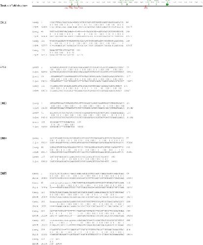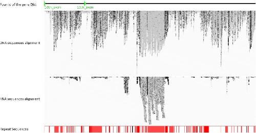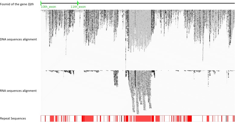 Fig. 2. One fosmid insert sequence of the gene Djth (DJF-016O13). This figure shows the alignment of genomic DNA and RNA sequencing reads to one fosmid insert sequence of the gene Djth (DJF-016O13) and the repeated elements annotation of this fosmid sequence by Repbase. Green arrowheads show the10th and 11th exon of the Djth gene on the fosmid insert sequence. Grey spots show matches between the sequencing reads and the reference fosmid sequence, and black spots show mismatches. Red bars represent repetitive sequences