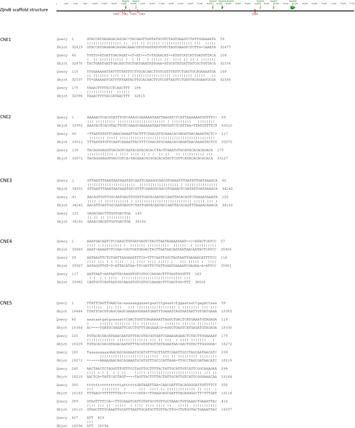 Fig. 4. Alignment between the Djth fosmid insert sequence and its corresponding genome scaffold. In the illustration of the Djth fosmid structure, green arrowheads show the 10th and 11th exons of the Djth gene in the fosmid (see Fig. 2). In the illustration of the Djth fosmid repeated sequences, red bars represent repetitive sequences. In the illustration of the alignment between Djth fosmid and scaffold, pink blocks show matched sequences between the fosmid and the corresponding scaffold, while white blocks show mismatches, which were mainly caused by gaps in the scaffold