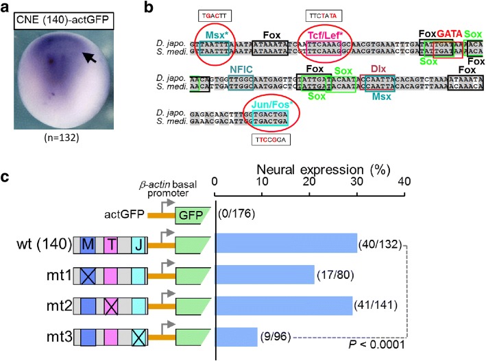 Fig. 7. Transgenic experiments suggested that Djndk CNE3 might be a regulatory element. a The arrowhead shows CNE3 inserted actGFP vector, CNE (140)-actGFP driven GFP to express in the anterior region at the end of gastrulation in transgenic Xenopus embryos (n = 132). b Putative transcription factor-binding motifs are boxed in different colors; those subjected to mutation analysis are indicated by asterisks. The detailed point mutation design of three transcription factor-binding motifs are shown by red colored words. c Mutation analysis of CNE3 (the 140 bp element). actGFP is an empty reporter construct that contains the β-actin basal promoter; wt (140) is the construct of CNE (140)-actGFP used in (a); mt1, m2 and mt3 are point mutations (Msx (M), Tcf/Lef (T), and Jun/Fos (J)) generated from wt (140), and the detailed mutation design is shown in (b). The bar chart shows the percentage of the embryos that showed GFP expression in the neural plate among total developed embryos injected with the vector constructs. Actual numbers of GFP-positive cases and total numbers of scored embryos are indicated in parentheses. The chi-square test showed that the percentage of positive cases in the wt (140) and the Jun/Fos mutant constructs are significantly different (P < 0.0001), whereas the differences observed in other cases were not significant (P > 0.05)