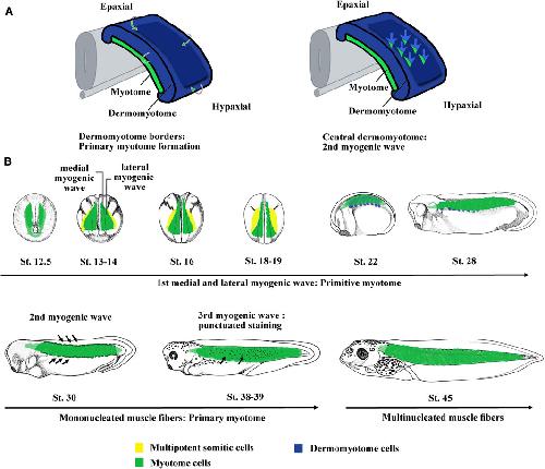 FIGURE 2. The myogenic waves and the myotome formation in amniotes and Xenopus. (A) The myotome is essentially derived from the dermomyotome in amniotes. The primary myotome is made of mononucleated cells arising from the four borders of the dermomyotome. Next cells coming from the central dermomyotome invade the primary myotome and contribute to the myotome growth. Hence, two myogenic waves are at the origin of myotome formation. Modified from Lagha et al. (2008a). (B) Myotome is the main somite compartment in Xenopus and is formed by at least three myogenic waves. The first myogenic wave is made up of two subpopulations, a medial and a lateral one, constitutes the primitive myotome and arises directly from paraxial mesoderm. The second myogenic wave arises from epaxial and hypaxial border of the dermomyotome at stage 28–30. The third myogenic wave has been visualized by myf5 mRNA staining that marked isolated round cells inside the myotome at stage 37–38. The myotome is initially made up of mononucleated fibers until stage 45 when the first multinucleated muscle fibers were observed. Hence, it can be considered that both the first wave of primitive myotome and the second wave of hypaxial and epaxial dermomyotome contribute to the formation of primary myotome. The third could participate to plurinucleated fibers formation and myotome growth. St., stage. |