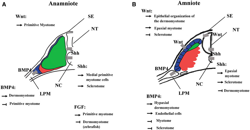 FIGURE 7. Main functions of BMP, FGF, Wnt, and Shh signalings during somite compartmentalization in anamniotes (A) and amniotes (B). Somite compartmentalization depends on signals expressed by surrounding tissues. Shh is expressed by notochord (NC) and floor plate, Wnt by surface ectoderm (SE) and dorsal neural tube (NT) and BMP4 by lateral plate mesoderm (LPM). Most of the functions fulfilled by the signaling molecules seem to be conserved between anamniotes (A) and amniotes (B). However, it seems that Fgf and to a lesser extent Wnt may play an early role in the formation of primitive myotome only in anamniotes (A). Arrows, promoting effect; T-shaped line, inhibitory effect. |