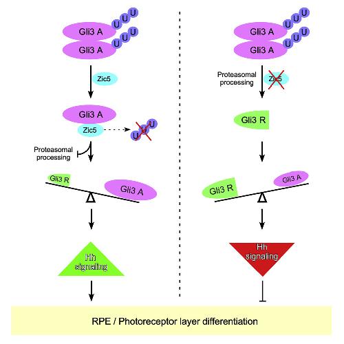 The Zic family of zinc finger transcription factors plays a critical role in multiple developmental processes. Using loss-of-function studies, we find that Zic5 is important for the differentiation of retinal pigmented epithelium (RPE) and the rod photoreceptor layer through suppressing Hedgehog (Hh) signaling. Further, Zic5 interacts with the critical Hh signaling molecule, Gli3, through the zinc finger domains of both proteins. This Zic5-Gli3 interaction disrupts Gli3/Gli3 homodimerization, resulting in Gli3 protein stabilization via a reduction in Gli3 ubiquitination. During embryonic Hh signaling, the activator form of Gli is normally converted to a repressor form through proteosome-mediated processing of Gli3, and the ratio of Gli3 repressor to full-length (activator) form of Gli3 determines the Gli3 repressor output required for normal eye development. Our results suggest Zic5 is a critical player in regulating Gli3 stability for the proper differentiation of RPE and rod photoreceptor layer during Xenopus eye development.