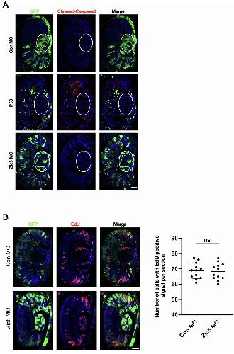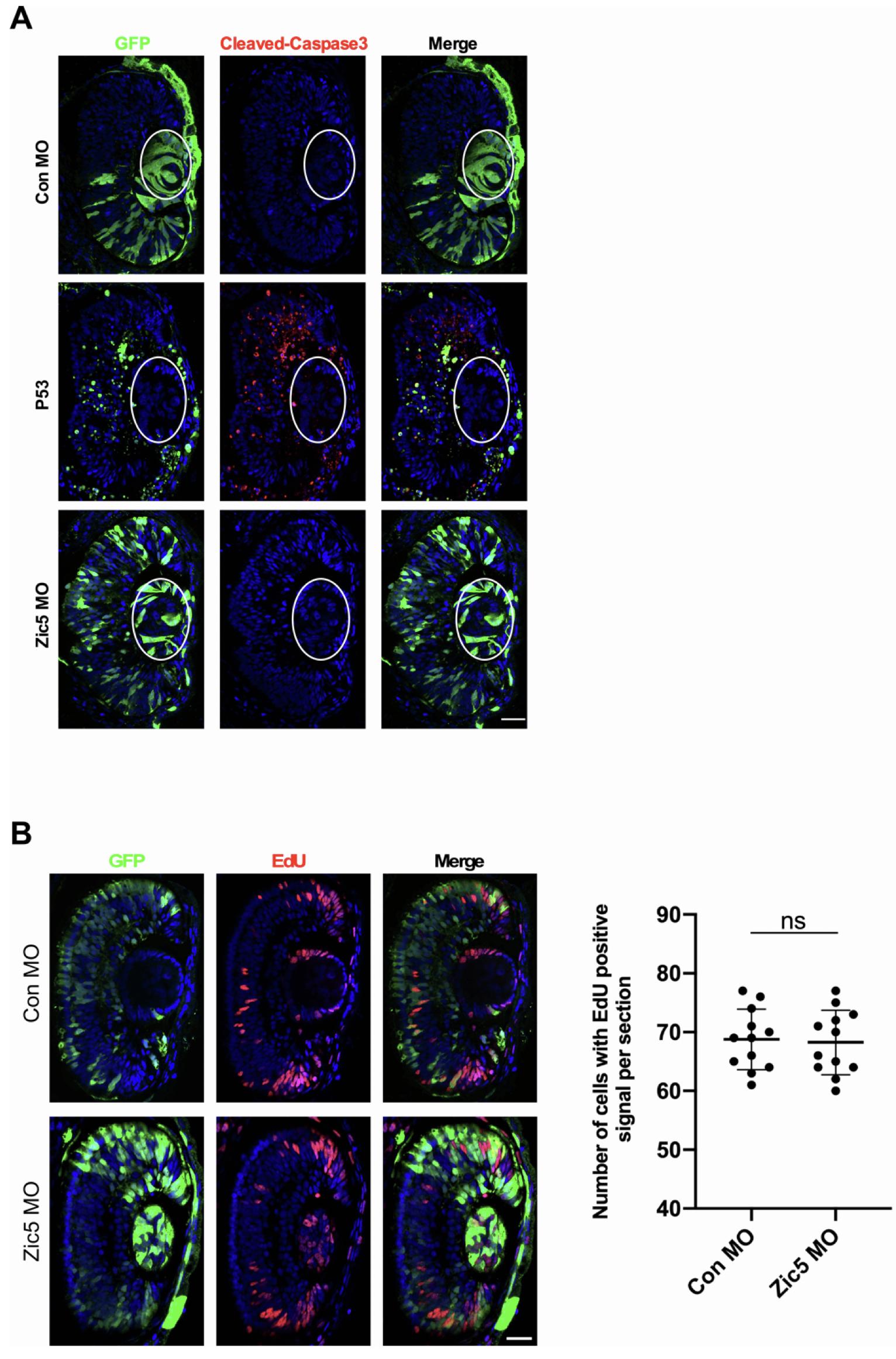 Figure S3. Related to Figure 2. Knockdown of Zic5 did not induce cell apoptosis or EdU incorporation in the eye. (A) Con MO or Zic5 MO was injected with GFP RNA into the D1.1.1 blastomere at 32 -cell stage. Embryos were sectioned and immunostained with cleaved-Caspase3 antibody at stage 37. P53 RNA injection was used as a positive control. Scale bar, 40 μm. (B) Con MO or Zic5 MO was injected with GFP RNA into the D1.1.1 blastomere at 32 -cell stage. Embryos were then injected intra-abdominally EdU (5-ethynyl-2ʹ-deoxyuridine; 1 mM) at stage37. Three hours after injection, embryos were harvested. Quantification of EdU positive cells in retina with unpaired t test, Scatterplots represent means ± s.d from three biological repeats, ns: no statistical differences between the groups. Scale bar, 40 μm. |
