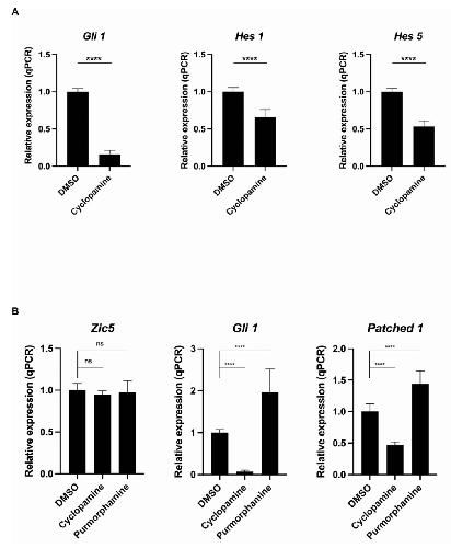 Figure S4. Related to Figure 3. The expression of Hes1 and Hes5 but not Zic5 was regulated by Hh signal in the developing eyes. (A) Embryos were treated with DMSO or cyclopamine from stage 18-19. 40 eyes per group were then dissected at stage 38 for quantitative PCR analysis. Quantification of normalized fold expression of indicated genes with unpaired t test, ****, P < 0.0001. Histograms represent means ± s.d. (B) Embryos were treated with DMSO or cyclopamine or purmorphamine from stage 18-19. 40 eyes per group were then dissected at stage 38 for quantitative PCR analysis. Quantification of normalized fold expression of indicated genes with one-way ANOVA (Dunnettâs multiple comparisons test), ****, P < 0.0001. Histograms represent means ± s.d. ns: no statistical differences between the groups. |