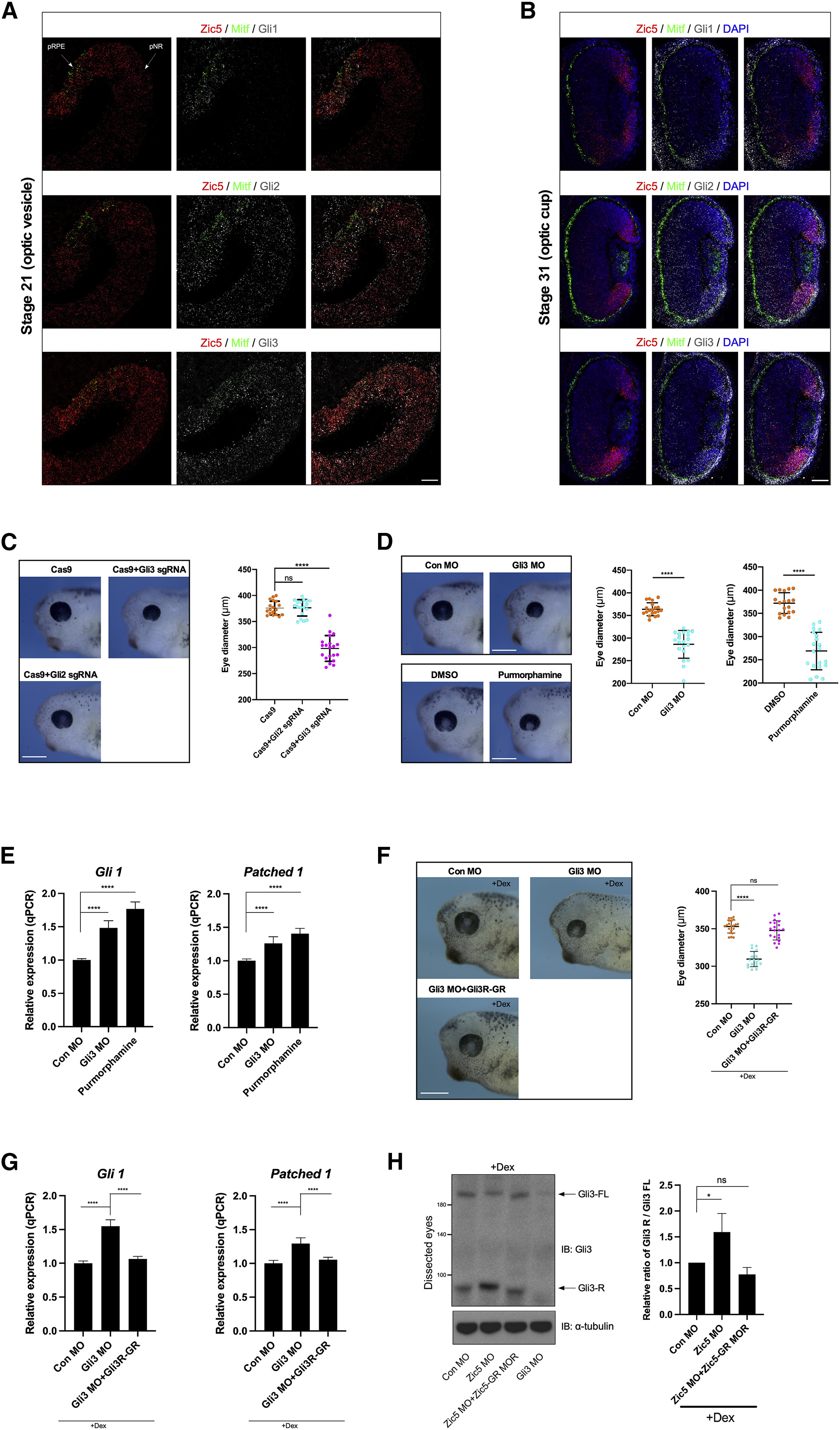 Figure 4. Gli3 functions as a repressor for Hh signaling in Xenopus eye development (A) HCR analysis was performed using embryos from stage 21 (optic vesicle stage) with indicated probe sets. White arrows indicate pre-retinal pigmented epithelium (pRPE) and pre-neural retina (pNR). Mitf probes were used as an RPE marker. Scale bar, 40 μm. (B) HCR analysis was performed using embryos from stage 31 (optic vesicle stage) with indicated probe sets. Scale bar, 40 μm. (C) Gli3 knockout reduces eye size. Eye diameter was quantified with one-way ANOVA (Dunnett's multiple comparisons test). ââââp < 0.0001. Scatterplots represent means ± SD from three biological repeats, ns: no statistical differences between the groups. Scale bar, 400 μm. (D) Gli3 knockdown or activation of Hh pathway by purmorphamine decreases eye size. Eye diameter was quantified with unpaired t test, ââââp < 0.0001; scale bars, 400 μm. Scatterplots represent means ± SD from three biological repeats. (E) Quantitative PCR analysis of the expression of Gli1 and Patched1 from dissected eyes injected with control MO or Gli3 MO or treated with purmorphamine. Quantification of normalized fold expression of indicated genes with one-way ANOVA (Dunnett's multiple comparisons test), ââââp < 0.0001. Histograms represent means ± SD. (F) Indicated MOs or RNA was injected with GFP RNA into D1.1.1 blastomere at the 32-cell stage. The eye phenotypes were analyzed at stage 37. Eye diameter was quantified with one-way ANOVA (Dunnett's multiple comparisons test), ââââp < 0.0001; scale bar, 400 μm. ns: no statistical differences between the groups. Scatterplots represent means ± SD from three biological repeats. (G) Quantitative PCR analysis of the expression of Gli1 and Patched1 from dissected eyes injected with control MO or Gli3 MO or Gli3 MO plus Gli3R-GR mRNA. Quantification of normalized fold expression of indicated genes with one-way ANOVA (Dunnett's multiple comparisons test), ââââp < 0.0001. Histograms represent means ± SD. (H) Indicated MOs and RNA were injected into D1.1.1 blastomere at 32-cell stage. Embryos were treated with dexamethasone (4 μg/ml) from stage 16 for rescue purpose. Approximately, 46 eyes were dissected at stage 35 for each sample, lysed, and immunoblotted with anti-Gli3 N-terminal antibody. Quantification of relative ratio of Gli3R/Gli3FL of western blot from (F) with one-way ANOVA (Dunnett's multiple comparisons test), âp < 0.05. Histograms represent means ± SD from three biological repeats. ns: no statistical differences between the groups. |