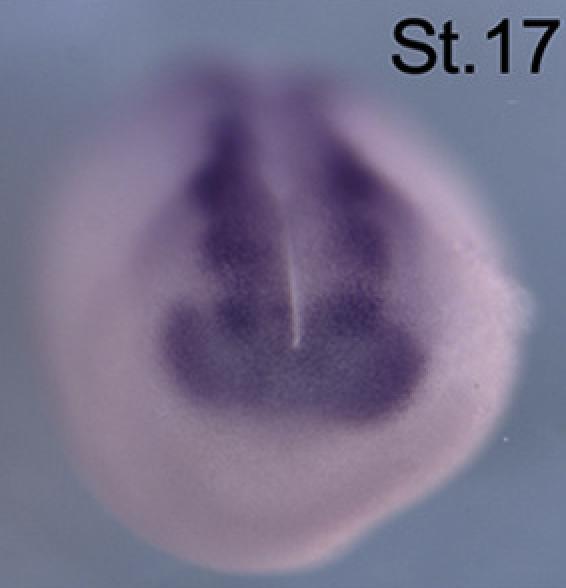zic5 (Zic family member 5) gene expression in Xenopus laevis embryo, via in situ hybridization, NF stage 17, dorsal view. |