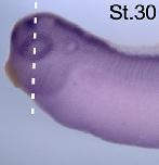 zic5 (Zic family member 5) gene expression in Xenopus laevis embryo, via in situ hybridization, NF stage 30, lateral view, anterior left, dorsal up. |