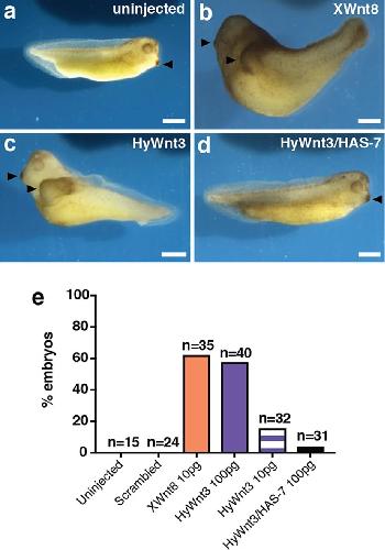 Fig.4 HAS-7 inhibits HyWnt3 induced ectopic axis in Xenopus laevis axial duplication assay. a, b Xenopus Wnt8 (XWnt8) mRNA injection induces axis duplication in Xenopus embryos compared to uninjected controls. c HyWnt3 mRNA induces axis duplication comparable to XWnt8 mRNA. d Double injection of HyWnt and HAS-7 mRNAs reverts the axis duplication phenotype. e Quantification of embryos showing a double axis phenotype. Injected mRNA doses were as indicated. n indicates the number of embryos analyzed for each experimental condition. Arrows indicate cement glands. Scale bars = 100âμm. |