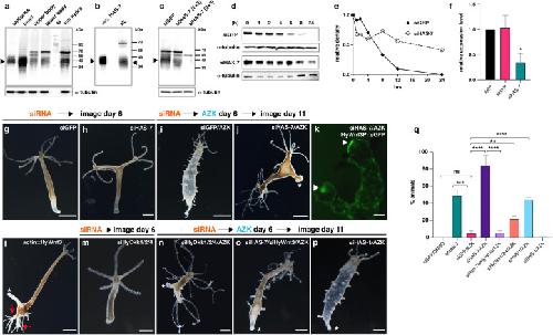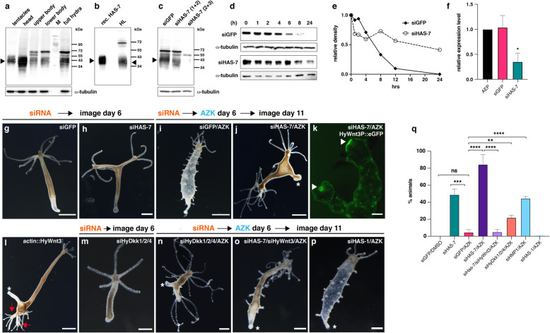 Fig. 3 Functional analysis of HAS-7 knockdown. a Detection of HAS-7 protein in body lysate samples using a polyclonal HAS-7 antibody. M = protein marker. Tubulin was used as loading control of the respective hydra lysates. The arrow indicates the position of the HAS-7 protein band, also in b and c. b Recombinant HAS-7 protein expressed in High Five cells compared to native protein in HL as detected by a HAS-7-specific antibody. Note that the slightly higher apparent molecular mass is due to the introduced histidine tag of recombinant HAS-7. c Knockdown effect of different siRNA combinations on HAS-7 protein levels was assayed by anti-HAS-7 Western blot analysis of complete hydras treated as indicated. Tubulin was used as loading control of the respective hydra lysates. The distinct band at 70âkâDa in a-c likely represents a dimer of processed HAS-7. d HyWnt3-His proteolysis is impaired in HL of animals electroporated with siHAS-7 (2 +â3) as compared to siGFP control animals. Head lysates were generated 6âdays after electroporation. Tubulin was used as loading control of the respective HL applied for each time point. e Relative intensities of the Western blot bands in d. f Quantitative real-time PCR analysis of HAS-7 expression in head tissues confirms the decreased expression in siHAS-7 treated animals compared to siGFP treated and untreated (steady-state AEP animals) controls. Relative expression levels are given in 2(-ÎÎCt). Results represent mean +/â S.D. from 3 independent experiments, analyzed by t tests. *p <â0.05. The individual data values are shown in Additional file 14. g siGFP control electroporation without AZK treatment shows normal morphology. Scale bar = 500âμm. h siHAS-7 electroporation without AZK treatment shows animals with double axis lacking ectopic tentacles. Scale bar = 200âμm. i siGFP control animal showing ectopic tentacle formation after AZK treatment. Scale bar = 200âμm. j Double axis phenotype with ectopic tentacles near the head region in hydras treated with AZK after HAS-7 (2 +â3)/GFP siRNA electroporation. The asterisk denotes the peduncle region. Scale bar = 500âμm. k Both heads in HyWnt3P::HyWnt3 transgenic animal treated as in j exhibit hypostomal HyWnt3 expression (arrow). Smaller spots along the body column represent ectopic organizers that usually give rise to ectopic tentacles as in i. Scale bar = 200âμm. l Ectopic axis phenotype in actin::HyWnt3 transgenic hydra. Red arrows indicate multiple secondary heads. m No double axis was observed in hydras after HyDkk1/2/4/GFP siRNA electroporation. Scale bar = 500âμm. n Double axis phenotype in hydras after HyDkk1/2/4/GFP siRNA electroporation and AZK treatment. Scale bar = 500âμm. o Rescue of double axis phenotype in animals treated with AZK after electroporation with a combination of HAS-7 (2 +â3) and HyWnt3 siRNAs. Scale bar = 200âμm. p No double axes were observed in hydras treated with AZK after electroporation with HAS-1/GFP siRNAs. q Ratios of double axis phenotypes in hydras after electroporation with siGFP or combinations of siRNAs as indicated. In animals without subsequent AZK treatment double axes were counted 6âdays after electroporation. In animals treated additionally with AZK, incubation was started 6âdays after electroporation and the numbers of double axes in each group were counted 5âdays after AZK removal. Total numbers of animals with double axis phenotype in each group were: siGFP/DMSO = 0/192 (n=5), siGFP/AZK = 10/230 (n=5), siHAS-7/siGFP = 90/186 (n=4), siHAS-7/siGFP/AZK = 203/248 (n=6), siHAS-7/siHyWnt3/AZK = 11/203 (n=3), siHyDkk1/2/4/siGFP/AZK = 65/290 (n=3), siHMP1/siGFP/AZK = 93/204 (n=3), siHAS-1/siGFP/AZK = 1/150 (n=3). Results from at least three independent experiments are shown. Each column represents the total percentage of one group, bars indicate the mean ± S.E.M. ****P value <â0.0001, ***P value <â0.0005, **P value <â0.001. ns = not significant. The data were analyzed using an unpaired parametric T test with Welchâs correction followed by pairwise multiple comparisons of each group with the other groups. The individual data values are shown in Additional file 14 |