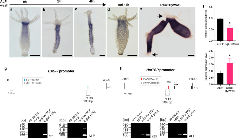 Fig. 5 beta-Catenin dependent expression of HAS-7. aâc ISH analysis of HAS-7 expression after ALP treatment shows a global upregulation after 24âh and a shift towards the developing ectopic organizers along the body column after 48âh as compared to DMSO-treated controls (d). At 0âh after ALP wash (a) no change of the HAS-7 expression pattern compared to untreated controls (compare d and Fig. âFig.2c)2c) was evident. Scale bars = 150âμm. e HAS-7 expression is globally upregulated in the gastric region of a transgenic actin::HyWnt3 animal with ectopic axis. Scale bar = 250âμm. Arrows indicate head structures. Representatives of 10 hydras examined. f Quantitative real-time PCR analysis of HAS-7 expression confirms the upregulated expression in actin::HyWnt3 animals compared to steady-state AEP animals (lower panel). Inhibition of beta-Catenin by siRNA knockdown reduces HAS-7 expression levels compared to siGFP treated controls (lower panel). Relative expression level is given in 2(-ÎÎCt). Results represent mean +/â S.D. from 3 independent experiments, analyzed by t tests. *p <â0.05. The individual data values are shown in Additional file 14. g, h No detectable binding of Hydra TCF to the HAS-7 promoter. g ChIP analysis of the Hydra magnipapillata HAS-7 promoter. Upper site: Topography of the HAS-7 5â²-untranslated region (nt 1 to 4529). The ATG indicates the translation start site. The position of a canonical TCF binding motif (5â²-CTTTGTT-3â²) is indicated by a blue bar. The localization of the 165-bp DNA segment flanked by the specific ChIP primer pair is visualized with a grey bar. Lower site: ChIP analysis of the Hydra HAS-7 promoter region using chromatin from untreated whole hydra animals (ctrl), and from animals treated with ALP. A polyclonal antibody directed against Hydra TCF was used for precipitation, followed by PCR amplification of the indicated fragment from the HAS-7 regulatory region. Reactions with normal rabbit serum (NRS) or total chromatin (Input) were used as controls (n = 2). PCR products were resolved by agarose gel electrophoresis, and visualized by ethidium bromide staining. h ChIP analysis of the HmTSP promoter performed under the same conditions as in g and used as a positive control. Upper site: Topography of the 3,000-bp HmTSP promoter (nt â 2191 to +â809). Black boxes depict the first two exons of the HmTSP gene. The arrow indicates the transcription start site of the HmTSP mRNA, and ATG the translation start site. The position of the tested canonical TCF binding motif (5â²-AACAAAG-3â²) is indicated by a red bar. The localization and size of a 164-bp DNA segment flanked by the specific ChIP primer pair is visualized with a grey bar. Lower site: ChIP analysis as described under (g) (n = 2). |