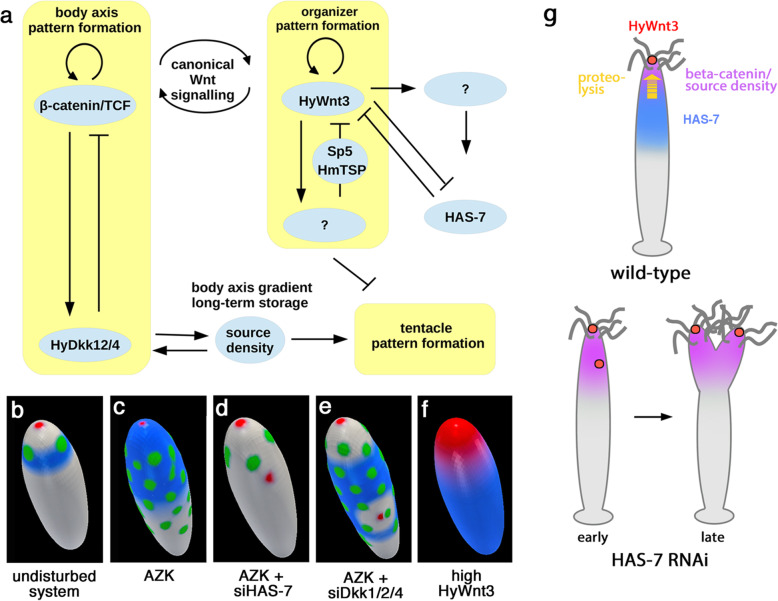 Fig. 7 Mathematical model of HAS-7 function. a Schematic representation of the model. Yellow blocks depict self-containing pattern formation systems consisting of an activator and an inhibitor. bâf Numerical simulations of different experimental scenarios. The blue color corresponds to high levels of HAS-7 expression, the red color to HyWnt3 expression, and the green color indicates the formation of tentacles. The scale of these expression intensities is similar across all simulation plots. g Schematic diagram summarizing the role of HAS-7 in restricting the organizer in steady-state hydras and double axis induction after experimental HAS-7 gene silencing |