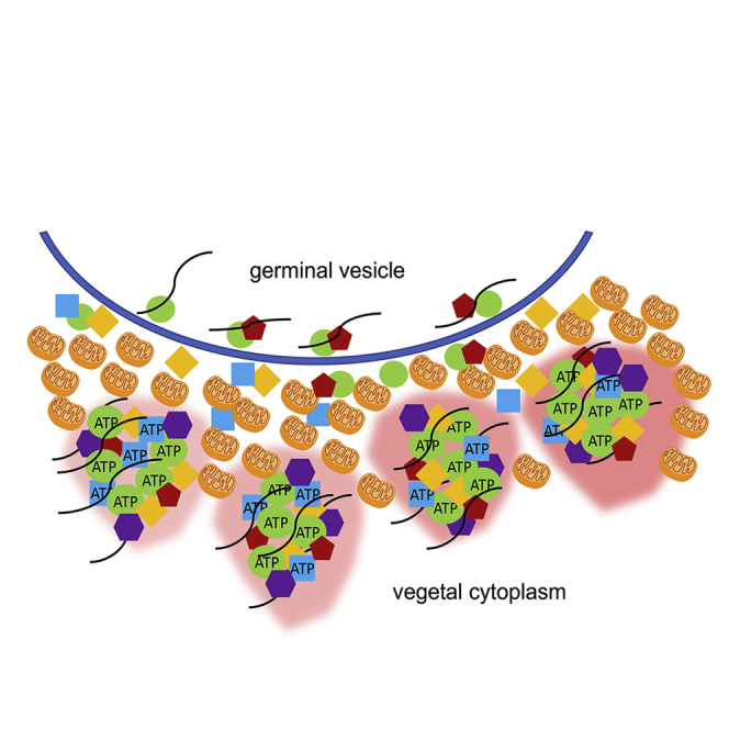 The Balbiani body (Bb), an organelle comprised of mitochondria, ER, and RNA, is found in the oocytes of most organisms. In Xenopus, the structure is initially positioned immediately adjacent to the nucleus, extends toward the vegetal pole, and eventually disperses, leaving behind a region highly enriched in mitochondria. This area is later transversed by RNP complexes that are being localized to the vegetal cortex. Inhibition of mitochondrial ATP synthesis prevents perinuclear formation of the transport complexes that can be reversed by a nonhydrolyzable ATP analog, indicating the nucleotide is acting as a hydrotrope. The protein composition, sensitivity to hexanediol, and coalescence in the absence of transport provide evidence that the transport RNP complexes are biocondensates. The breakdown of the Bb engenders regions of clustered mitochondria that are used not to meet extraordinary energy demands, but rather to promote a liquid-liquid phase separation.