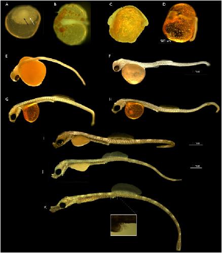 Fig 1. Embryonic development of the bay pipefish.A. Blastula/disc stage. The black arrow indicates the lateral border of the dense disc of cells. The white arrow indicates a larger disc of more dispersed material that the cellular disc sites upon. Approximate equivalent; medaka stage 11–12. B. Early segmentation stage. Anterior end of embryo is to the left. Approximate medaka stage 18–19. C. Late segmentation stage, lateral view. Retina obvious. Approximate medaka stage equivalent is stage 22. D. Early pharyngula stage. Retina obvious, extensive somitogenesis. Posterior tail is not attached to yolk sac. Approximate equivalent; medaka stage 25, except the tail is longer and detached in the pipefish. E. Mid-pharyngula stage. No snout, no fin blastemas. F. Mid pharyngula stage II. Slight protuberance in future snout region (white arrow). Dorsal and caudal fin blastemas present, first dorsal fin rays are emerging, no rays in caudal fin. G. Late pharyngula stage. Future snout small. Dorsal fin rays still forming, first rays in caudal fin are apparent. H. Late pharyngula stage. Future snout small. Dorsal fin rays still forming, first rays in caudal fin are apparent. I. Early hatching stage. Snout distinct, jaw visible and mouth can open. Dorsal and caudal fin rays are well developed. Yolk sac is 50% absorbed. J. Mid hatching stage. Snout becoming longer, tail extending, yolk sac remnant rapidly decreasing in size, approximately 25% of original size. K. Late hatching stage, early fry stage, shortly before emergence. Elongated snout, well developed dorsal fin. Yolk sac has been resorbed. Birth imminent. The panel in K illustrates the anal fin in this embryo under higher magnification. Further details on the developing snout and fins are present in the following figure.