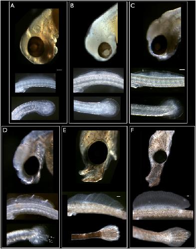 Fig 2. Anatomical features of pharyngula and hatching stage embryos.Scale bars in A, C, E and F represent 100 microns, white arrows indicate fin rays. A. Mid-pharyngula stage, no mouth, dorsal fin and caudal fin blastemas. Otolith visible. B. Similar to A, but slightly older. C. Mid pharyngula stage. Slight protuberance in future mouth region. Dorsal fin rays are emerging, no rays in caudal fin. D. Late pharyngula stage. Future snout small. Dorsal fin rays still forming, first rays in caudal fin are apparent. E. Early hatching stage. Snout distinct, jaw visible and mouth can open. Dorsal and caudal fin rays are well developed. Yolk sac is 50% absorbed. Melanocytes star shaped. F. Late hatching stage, early fry stage, shortly before emergence. Elongated snout, well developed dorsal fin. Yolk sac has been resorbed and birth is imminent.