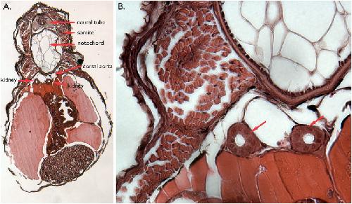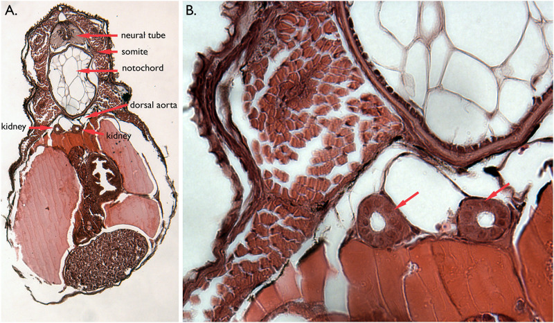 Fig 3. Internal anatomy of mid-hatching stage bay pipefish.A. Transverse section of a JB4 plastic embedded specimen. Various dorsal tissues surrounding the kidney tubules are labelled. B. Enlargement of panel A. The red arrows indicate the kidney tubules.
