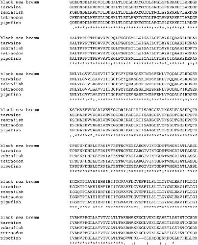 Fig 4. Translated protein sequence of bay pipefish atp1a aligned to related proteins from various fresh and salt water fishes.Amino acid residues conserved in all species are indicated with a ‘*’, highly similar amino acids with a ‘:’ and similar amino acids with a ‘.’. The NCBI accession numbers of aligned proteins are; black sea bream, ABR10300.1, tarwhine, AAT48993.1; zebrafish AAI63629.1; tetraodon, CAF97804.1. The first conserved amino acid of the pipefish protein, the lysine residue (K), corresponds to amino acid 25 of the zebrafish reference protein.