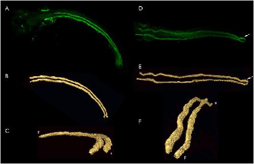 Fig 6. Confocal image stacks and computer generated renderings of aglomerular kidney structure in bay pipefish late pharyngula embryos.A-C, three views of a single set of aglomerular tubules. A. Dorsal view, anterior left, confocal stack. B. AMIRA generated surface model of the data illustrated in panel A. C. The same model as illustrated in panel B rotated so that the anterior portion of the kidney is on the lower right, closest to the viewer. a, anterior; p, posterior. D-F, three views of a single set of aglmoerular tubules. D. Confocal stack. E. AMIRA surface model of the same set of tubules as illustrated in D. F. The model illustrated in E rotated with the posterior end now closest to the viewer. a, anterior; p, posterior. 3D rotations of these models can be viewed in S1–S4 Videos.