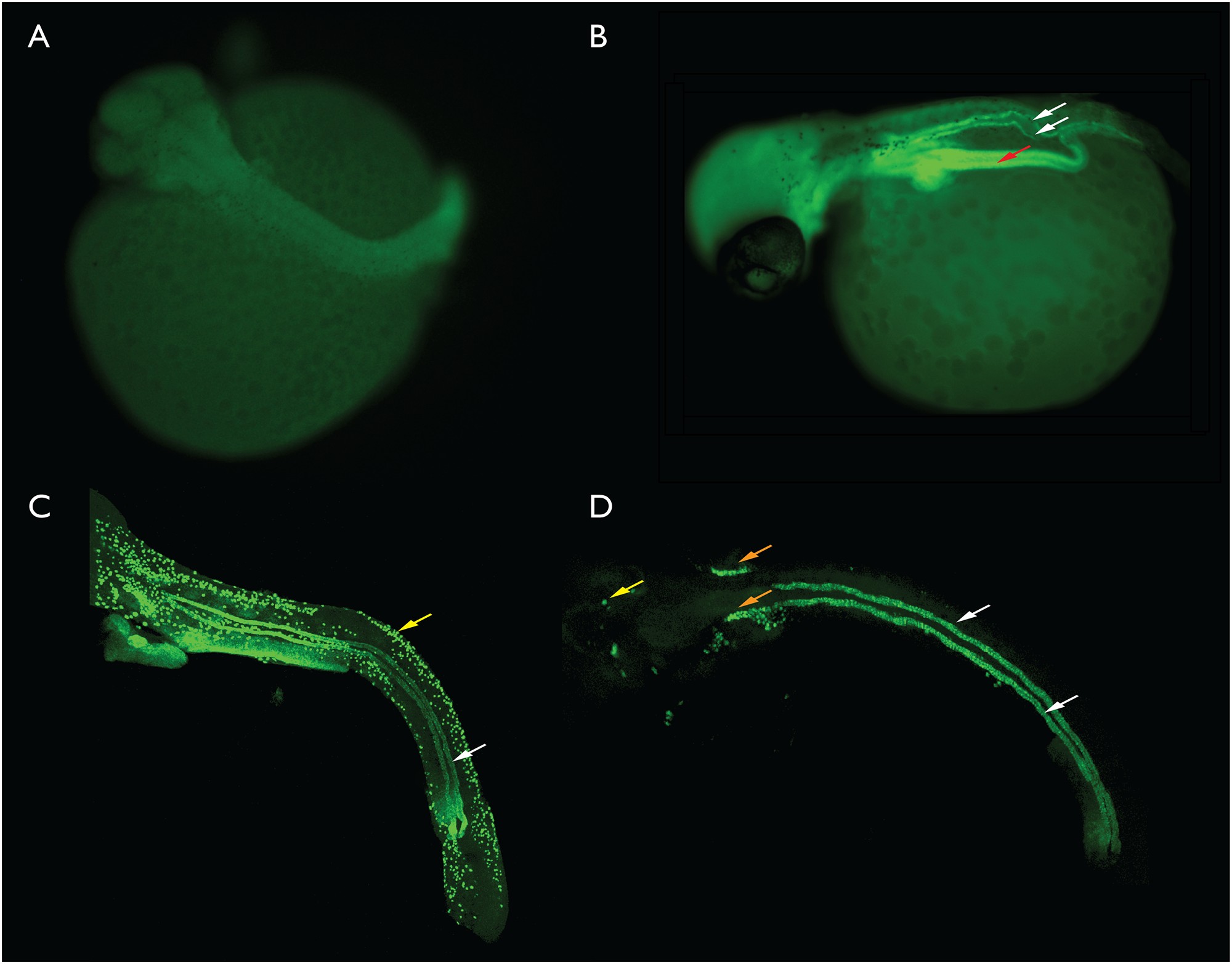 A. Late segmentation stage, no kidney is visible. B. Early pharyngula, paired kidney tubules are present and atp1a positive (white arrows). The gut tube is also fluorescent (red arrow). C. Scanning confocal generated image stack illustrating the kidney tubules (white arrow) and ionocytes (yellow arrow) in a late pharyngula embryo. D. Late pharyngula scanning confocal generated image stack. This stack was collected only in the plane of the kidney so most other labelled structures were not present. An unknown structure (orange arrows), possibly the developing gills and some ionocytes (yellow arrow) were also present in the image stack. For the purpose of scale, the eye in the early pharyngula in panel 5B is approximately 150 microns in diameter.