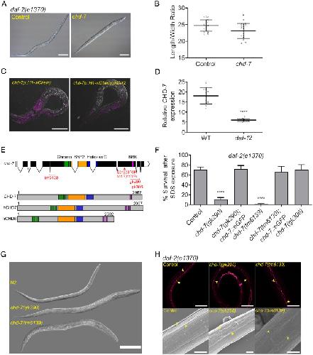 Fig. 1. The DAF-12 regulated target chd-7 is required for proper dauer morphogenesis. (A) chd-7(RNAi) causes a partial dauer phenotype in daf-2(e1370). Representative DIC photomicrographs of normal and partial dauers from daf-2(e1370) exposed to Control (L4440) or chd-7 dsRNA, respectively. (Scale bars: 50 uM.) (B) Quantification of axial ratio of daf-2(e1370);control(RNAi) and daf-2(e1370);chd-7(RNAi) dauers. Three biological replicates were scored (n = 16 to 21 worms per replicate). Horizontal black lines represent mean with SD. Unpaired t test, *P < 0.05. (C) daf-12 regulates chd-7 expression. Representative images of chd-7 transcriptional reporter, chd-7p::H1-wCherry or chd-7p::H1-wCherry;daf-12(rh61rh411) worms at L2/L3 stage. (Scale bars: 20 uM.) (D) Relative expression of the transcriptional reporter (n > 10 per strain). Unpaired t test, ****P < 0.0001. (E) C. elegans chd-7 gene and protein. (Upper) chd-7 genomic region. UTR and exons shown as bars; introns by lines. In red, available chd-7 deletional alleles (data obtained from Caenorhadbitis Genome Center and National Bioresearch Project). (Lower) The predicted protein isoforms of C. elegans CHD-7, human CHD7, and human CHD8. Signature domains in CHD proteins: two N-terminal chromodomains for interaction with a variety of chromatin components (green), a SNF-2 like domain with ATPase activity (yellow), and a helicase domain (blue). The class III subfamily is defined by a BRK domain (purple). (F) chd-7(gk290);daf-2(e1370) and chd-7(tm6139);daf-2(e1370) develop as SDS-sensitive dauer larvae. n > 725 animals per strain tested. Bars and horizontal black lines represent mean percentage with SD. χ2 test with Bonferroni correction for multiple comparisons. ****P < 0.0001. Asterisks represent the comparison to daf-2(e1370). (G) chd-7(gk290) and chd-7(tm6139) prevent dauer development upon starvation of otherwise wild-type worms. Representative DIC photomicrographs of N2 dauers, arrested L3-like chd-7(gk290), and a small chd-7(tm6139) adult. (Scale bar: 100 uM.) (H) chd-7;daf-2 partial dauers fail to develop the dauer alae. (Upper) Representative photomicrographs of daf-2(e1370) dauers or chd-7;daf-2(e1370) partial dauers expressing the ajm-1::GFP reporter to delineate the seam cell borders (arrowheads mark a subset of junctions). (Scale bars: 20 uM.) (Lower) Scanning electron microscopy images of daf-2(e1370) dauers or chd-7;daf-2(e1370) partial dauers (arrowheads mark alae details). (Scale bars: 5uM.)