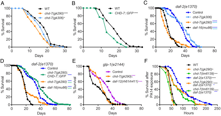 Fig. 2. chd-7 affects longevity and response to pathogen. (A–E) chd-7 promotes longevity in wild-type, daf-2(e1370), and glp-1(e2144) mutants. Mean survival days on OP50-1; survival data analyzed using Kaplan−Meier test. For all experiments, the asterisk in color represents strain of reference for statistical analysis. Details of number of animals and additional data from replicates can be found in SI Appendix, Table S1. (A) WT (18.12), chd-7(gk290) (14.91), chd-7(gk306) (16.53). *P < 0.05 and ****P < 0.0001 compared to the wild-type, N2 strain. (B) WT (17.85), CHD-7::GFP (14.35). ****P < 0.0001 compared to the wild-type, N2 strain. (C) daf-2(e1370) (35.58), chd-7(gk306);daf-2(e1370) (37.18), chd-7(gk290);daf-2(e1370) (17.47), daf-16(mu86);daf-2(e1370) (18.85). ****P < 0.0001. (D) daf-2(e1370) (27.9), chd-7(gk290);daf-2(e1370);CHD-7::GFP (30.84), chd-7(gk290);daf-2(e1370) (19.13), daf-16(mu86);daf-2(e1370) (14.48). ****P < 0.0001. (E) glp-1(e2144) (30.4), chd-7(gk290);glp-1(e2144) (28.37), glp-1(e2144);daf-12(rh61rh411) (25.99). *P < 0.05 and ****P < 0.0001. (F) chd-7 mediates the response against the opportunistic bacteria P. aeruginosa. Mean lifespan in hours (m) ± SEM. n is the number of animals analyzed/total number in experiment. WT (mean = 52.11 ± 0.96, n = 94 of 162), chd-7(gk290) (mean = 47.45 ± 1.05, n = 54 of 130), chd-7(tm6139) (mean = 44.47 ± 1.57, n = 56 of 80), daf-2(e1370) (mean = 105.46 ± 5.61, n = 65 of 115), chd-7(gk290);daf-2(e1370) (mean = 86.74 ± 4.21, n = 103 of 120), and chd-7(tm6139);daf-2(e1370) (mean = 79.13 ± 4.9, n = 50 of 60). *P < 0.05; ***P < 0.001 and ****P < 0.0001. Survival data analyzed using Kaplan−Meier test.
