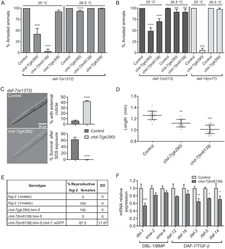 Fig. 3. CHD-7 functions in the TGF-β signaling pathway. (A and B) Loss of chd-7 suppresses dauer arrest of TGF-β pathway mutants at 25 °C but not 26.5 °C. Seven L4s were plated individually and grown at the specified temperature for 1 wk when arrested and nonarrested progeny were scored. Bars and horizontal black lines represent mean percentage with SD. Statistical significance was calculated using χ2 test with Bonferroni correction for multiple comparisons. ****,††††P < 0.0001 and £££P < 0.001. (A) Quantification of dauer arrest in chd-7;daf-7(e1372) mutants. The asterisks represent comparison to daf-7(e1372) grown at 25 °C and the daggers represent comparison to daf-7(e1372) at 26.5 °C. (B) Dauer arrest in TGF-β pathway mutant backgrounds. The asterisks represent comparison to daf-1(m213) grown at 25 °C, and the daggers represent comparison to daf-14(m77) at 25 °C; the pound symbols represent comparison to daf-1(m213) at 26.5 °C. (C) High temperature chd-7(gk290);daf-7(e1372) dauers are surrounded by undetached cuticle. (Left) Representative DIC photomicrographs of dauers grown at 26.5 °C for 1 wk. (Upper Right) Quantification of the population of animals with undetached cuticle. Two biological replicates were scored (n > 398/replicate). (Lower Right) chd-7(gk290);daf-7(e1372) develop as SDS-sensitive dauer larvae at 26.5 °C. n > 667 animals per strain tested. Bars and horizontal black lines represent mean percentage with SD. Statistical analysis was calculated using two-tailed unpaired t test. ****P < 0.0001. (D) chd-7 regulates body size. Body length of day 1 adults at 20 °C (n > 16). One-way ANOVA, **P < 0.01, ***P < 0.001 compared to wild-type, N2 strain. (E) chd-7(tm6139) males do not mate. Eight males from each strain tested were plated with four fog-2 females on 10-cm plates. After 24 h, fog-2 females were transferred to new plates and within 48 h the proportion of fertile females were scored. The assay was repeated twice. (F) Relative mRNA levels of genes from the DBL-1/BMP and DAF-7/TGF-β pathways in chd-(tm6139) or N2 L4s determined by qRT-PCR. Error bars indicate SE from three biological repeats. cdc-42 was used as housekeeping gene. Statistical significance was calculated using t test for multiple comparisons. *P < 0.05, **P < 0.01, and ***P < 0.001.