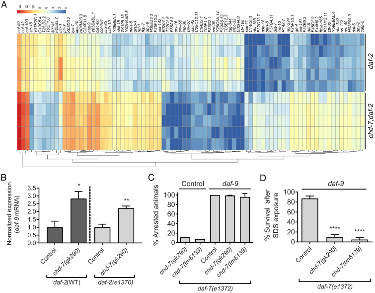 Fig. 4. RNA-seq analysis of transcriptome changes in chd-7(gk290) mutant dauers. (A) Heat map of expression values for the 84 DEGs (cutoff of 0.05 on FDR). DEGs were determined using DESeq2 (v1.20.0). The color scale represents the normalized count values in log2 scale. Hierarchical clustering of the DEGs is represented by dendrograms at bottom. (B) Expression levels of daf-9 mRNA are increased in chd-7(gk290); daf-2(e1370) partial dauers and in L3-like arrested chd-7(gk290) animals upon starvation (Fig. 1G). Error bars indicate SE from three biological repeats. Two-tailed unpaired t test. *P < 0.05 and **P < 0.01. (C) daf-9 knockdown in chd-7;daf-7(e1372) animals rescues dauer arrest at 25 °C. Two to three young L4s were plated on to freshly seeded plates with either daf-9 or Control empty vector RNAi and allowed to lay eggs. After 72 h, the adults were removed and the proportion of progeny that arrested as dauers was calculated. Bars and horizontal black lines represent mean percentage with SD (n > 598 total animals per strain). (D) daf-9 RNAi rescues arrest in chd-7;daf-7(e1372) animals but leads to partial dauers. Arrested animals grown at 25 °C on daf-9 RNAi plates were treated with 1% SDS for 30 min and survival was scored. Bars and horizontal black lines represent mean percentage with SD (n > 159 total animals per strain). One-way ANOVA, ****P < 0.0001, compared to daf-7(e1372).