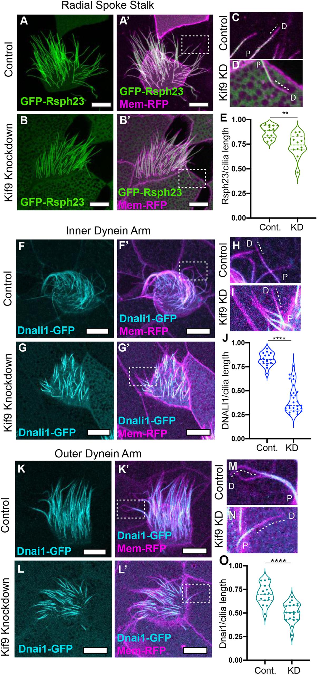Figure 4. Kif9 is necessary for radial spoke, inner dynein arm and outer dynein arm placement in the distal ends of cilia. (AâBâ²) Confocal images of radial spoke stalk component GFPâRsph23 (green) localization in control (A,Aâ²) and Kif9 MO (B,Bâ²) injected embryos. (C,D) Magnified views of cilia from area indicated in Aâ²,Bâ² for control (C) and Kif9 KD (D) cilia showing loss of GFPâRsph23 from the distal ends of cilia. Dotted line outlining lack of protein at distal ends. (E) Quantification of GFPâRsph23 length over total ciliary length in control and Kif9 KD embryos. (FâGâ²) Confocal images of inner dynein arm Dnali1âGFP localization in control (F,Fâ²) and Kif9 MO (G,Gâ²) injected embryos. (H,I) Magnified views of cilia from area indicated in Fâ²,Gâ² for control (H) and Kif9 KD (I) cilia showing loss of Dnali1âGFP from the distal ends of cilia. Dotted line outlining lack of protein at distal ends. (J) Quantification of GFPâDnai1 length over total ciliary length in control and Kif9 KD embryos. (KâLâ²) Confocal images of outer dynein arm GFPâDnai1 (cyan) localization in control (K,Kâ²) and Kif9 MO (L,Lâ²) injected embryos. (M,N) Magnified views of cilia from area indicated in Kâ²,Lâ² for control (M) and Kif9 KD (N) cilia showing loss of GFPâDnai1 (cyan) from the distal ends of cilia. Dotted line outlining lack of protein at distal ends. (O) Quantification of GFPâDnai1 length over total ciliary length in control and Kif9 KD embryos. Results in E,J,O are shown as violin plots with the median and quartiles marked by dashed lines. **P<0.01, ****P<0.0001 (unpaired two-tailed t-test). P, proximal; D, distal. Scale bars: 10â µm. |