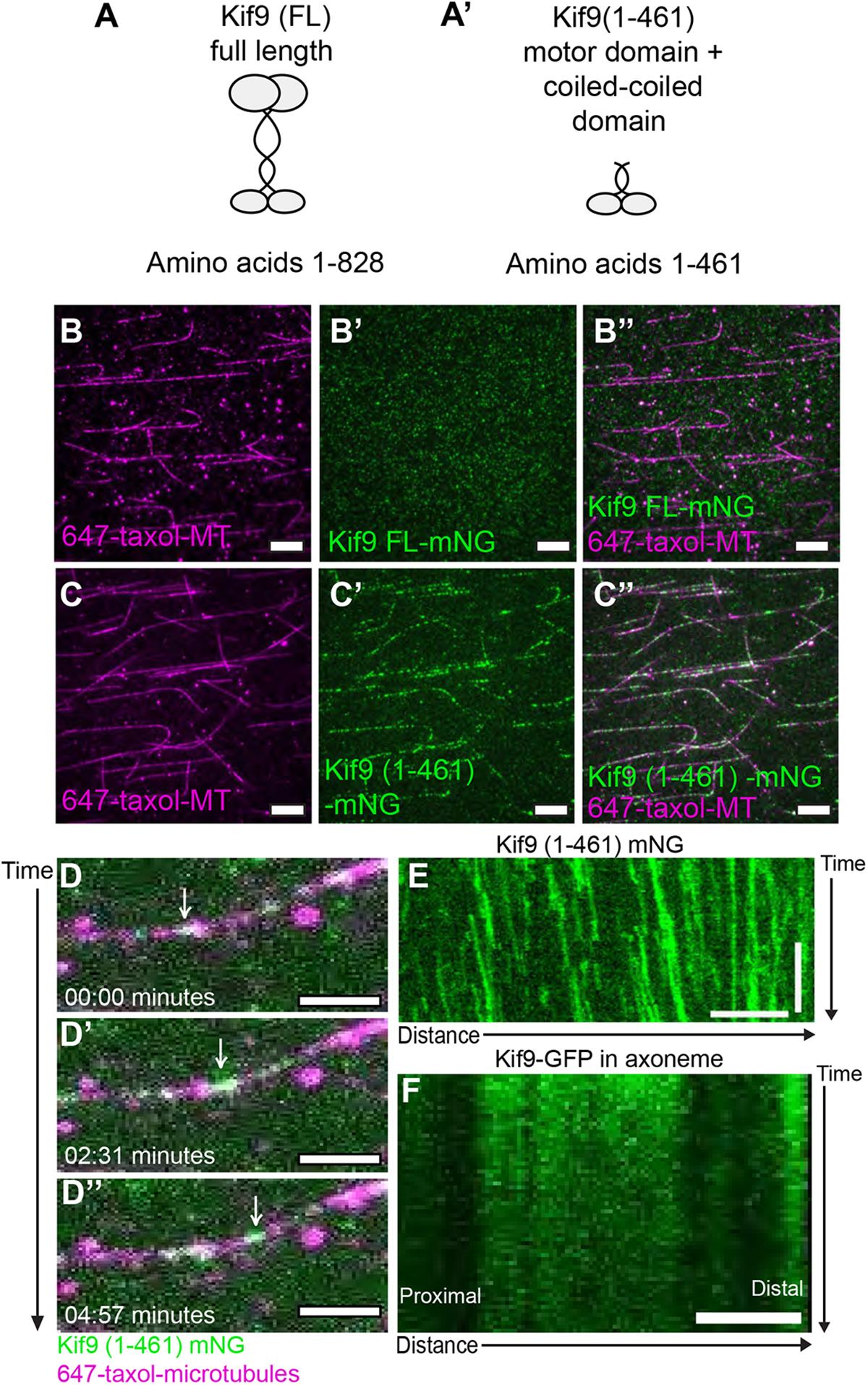 Figure 7. Motor activity of Xenopus Kif9. (A,Aâ²) Schematic of Xenopus laevis Kif9 constructs made for single-molecule assays. (BâBâ³) Images from single-molecule microtubule binding assays for full-length Kif9 [Kif9 (FL), green) on Taxol-stabilized microtubules (magenta). (CâCâ³) Images from single-molecule microtubule-binding assays for a truncated version of Kif9 [Kif9 (1-461), green] on Taxol-stabilized microtubules (magenta). Scale bars: 10â µm. (DâDâ³) Still frames from live imaging of Kif9 processivity on microtubules in minutes. White arrow follows a Kif9 particle (green) moving along a microtubule (magenta). Scale bars: 2â μm. (E) Kymograph of live imaging of Kif9 (1-461)-mNG in vitro on microtubules. Scale bars: 2â min (vertical) and 5â µm (horizontal). (F) Kymograph of live imaging of Kif9âGFP construct in vivo in Xenopus laevis multiciliated cell axonemes. Images are representative of 30 different cells imaged across three independent replicates with at least 10 experiments imaged for each replicate. Scale bar: 2â μm |