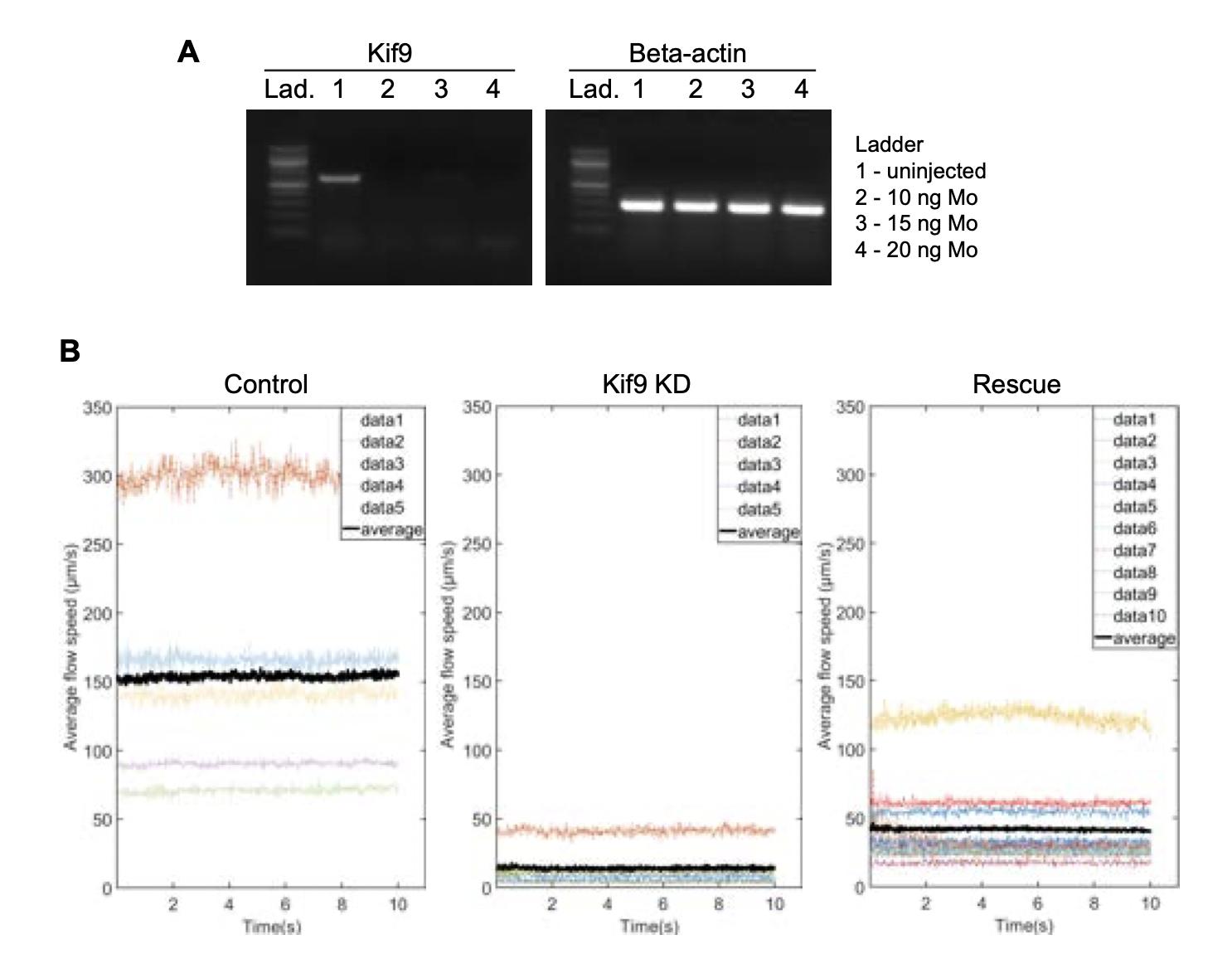 Fig. S1. A. Gel image of RT-PCR of Kif9 expression in Kif9 morpholino injected embryos at wildtype, 10 ng, 15 ng, and 20 ng doses. B. Graphs of average bead flow across the epidermis of stage 24 Xenopus embryos in Control, Kif9 morpholino, and Rescue injected embryos. |