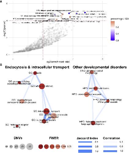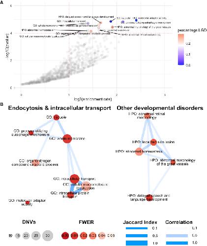 Figure 1. Pathway enrichment analysis(A) Volcano plot. Each dot represents a pathway. X axis represents the enrichment rate in log scale, and Y axis is the Poisson test p value in log10 scale. The horizontal dashed line marks family-wise error rate (FWER) of 0.05. Significant pathways (FWER < 0.05) are colored by the percentage of LGD variants, and other pathways are colored gray.(B) Pathway overlaps. Each circle represents a pathway with FWER < 0.05. Circle size is proportional to the number of observed de novo variants in the pathway; circle color represents the FWER; edge width is determined by the Jaccard index between two pathways, and edge color represents the correlation coefficient of the two pathways under the null in simulations.