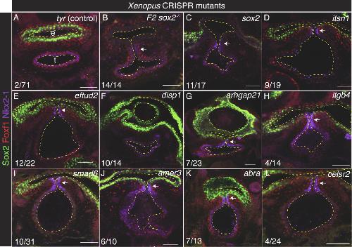 Figure 3. CRISPR-mutation of candidate risk genes in Xenopus disrupts trachea-esophagus morphogenesis(A–G) Representative confocal microscopy images of NF44 foregut from Xenopus CRISPR mutants. Sox2 F0 CRISPR mutants (C) have the same trachea-esophageal phenotype as sox2−/− F2 germline mutants (B), validating the F0 screen. Compared to control tyr mutations in which the trachea (t) and esophagus (e) have completely separated (A), mutation of 13/18 genes caused a failure of the foregut to separate into distinct trachea and esophagus (D–E and H–L) and/or resulted in a disrupted esophagus with multiple lumens (F and G). Dashed lines indicate the esophagus, trachea, and foregut lumens. Arrows point to a tracheoesophageal cleft. The number of embryos with a TED phenotype/total injected. Scale bars represent 50 μm.