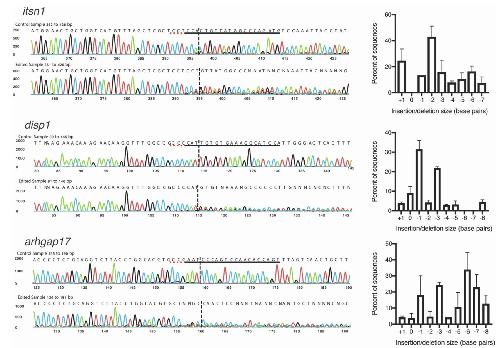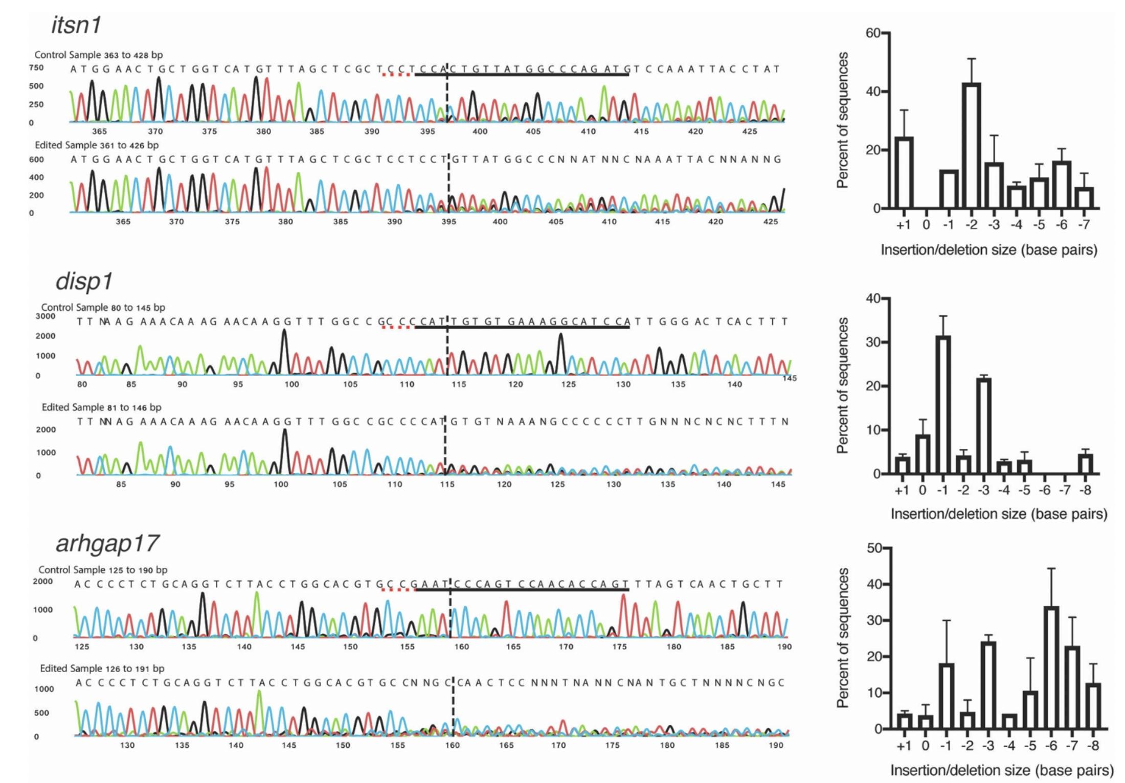 Supplemental Figure 1. Deconvolution of CRISPR-mediated indels in Xenopus embryos. CRISPR-Cas9-injected Xenopus embryos were genotyped by PCR amplification of the target region followed by Sanger sequencing. Sanger sequencing traces were analyzed using ICE software (Synthego, USA) to deconvolute the proportion and sequence of each indel mutation in each embryo. Representative sample traces are shown for gene editing of itsn1, disp1, and arhgap17 (traces generated by ICE). The gRNA sequence is indicated by black lines and the PAM sequence by dotted red lines. Dashed vertical black lines indicate the predicted location of the Cas9 cut site. Bar graphs indicate the percent of sequences with the indicated insertion or deletion size (in base pairs) ± standard error of the mean (n=5-10 embryos analyzed per graph). F0 CRISPR editing of embryos results in mosaic indels however each gRNA tends to generate similar mutation profiles in embryos within a given experiment (e.g. itsn1 gRNA tends to produce -2 and +1 bp indels).