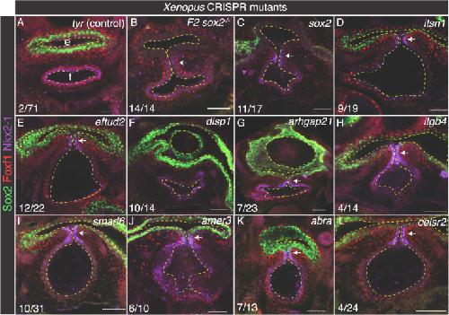 Figure 3. CRISPR-mutation of candidate risk genes in Xenopus disrupts trachea-esophagus morphogenesis